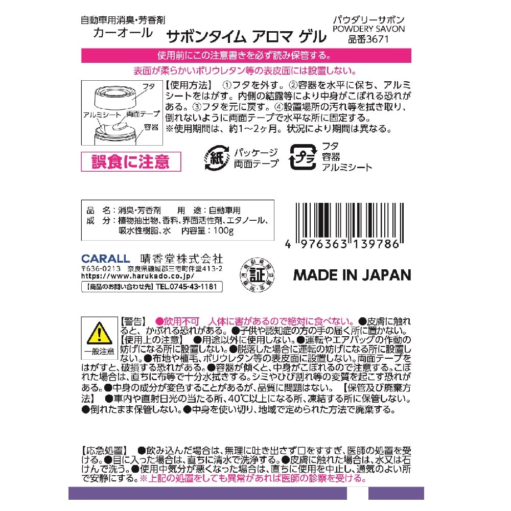 アロマ石けん香る、心やすらぐ空間 気品のあるアロマ石けんの香りを集めた消臭剤。 悪臭を感じにくくする香料“消臭アロマ”と植物消臭成分を配合。 上質な香りと消臭効果で、車内を心やすらぐ空間に。 ドリンクホルダーにピッタリな置き型タイプ。 使用期間 :約1~2ヶ月 ※使用状況により異なります。 パウダリーサボン:うっとりするような甘いアロマ石けんの香り