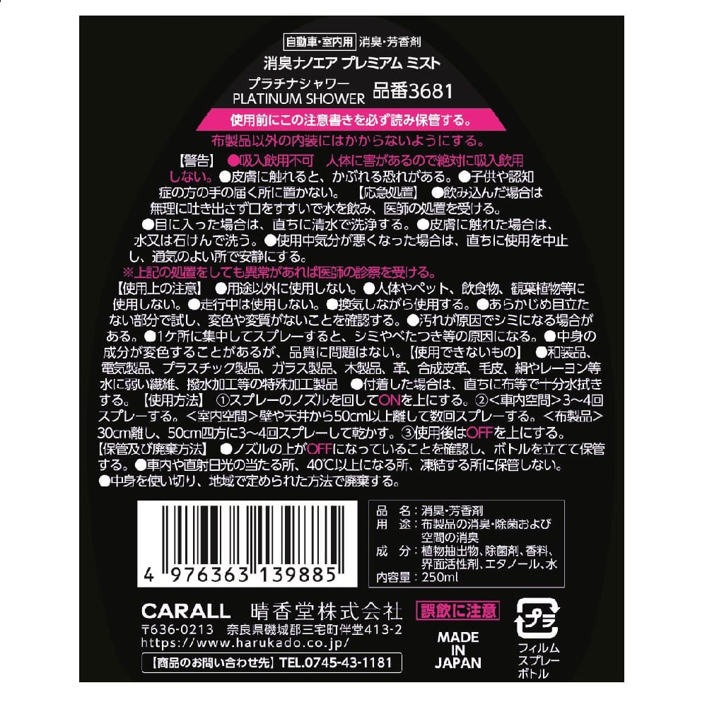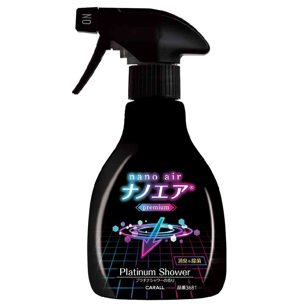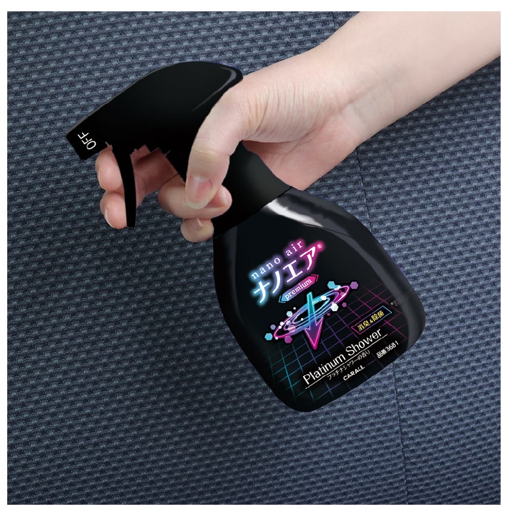 ナノ成分と消臭アロマ配合のプレミアム処方! ナノ成分が悪臭と反応してスピーディーに消臭・除菌! 消臭アロマの優しい香りが広がり、心地よい空間を演出! 車内や室内の空間、布製品など幅広く使えるミストタイプ。 プラチナシャワー:上質感あふれるプラチナシャワーの香り
