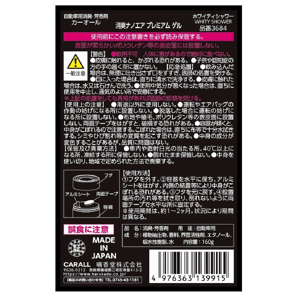 ナノ成分と消臭アロマ配合のプレミアム処方! ナノ成分が悪臭と反応してスピーディーに消臭! 消臭アロマの優しい香りが広がり、心地よい空間を演出! ドリンクホルダーにピッタリな置き型タイプ。 使用期間 :約1~2ヶ月 ※使用状況により異なります。 ホワイティシャワー:清潔感あふれるホワイティシャワーの香り