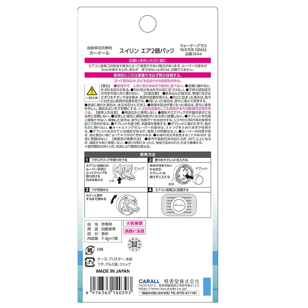 みずみずしく爽やかに。心地よさの広がる空間へ クリアな香りが車内を包み、爽やかなドライブ空間を演出。 鮮やかなブルーが彩るエアコンルーバー取付タイプ。 使用期間 :約1ヶ月 ※使用状況により異なります。 ウォーターグラス:翠雨したたる草花の爽やかな香り