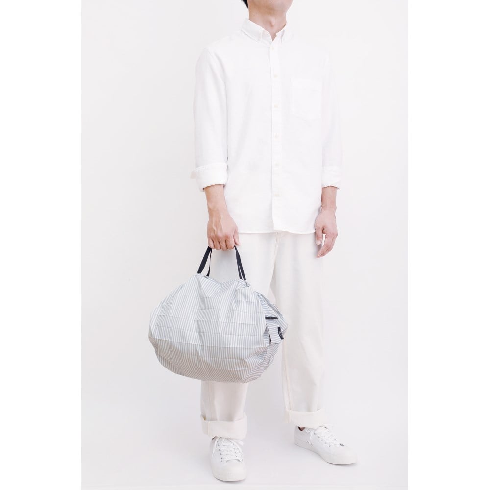 「シュパッと」一気にたためるコンパクトバッグ。 コンビニでの買い物や、急に増えた荷物入れに。 まとめる時は、ゴムで簡単に留められます。