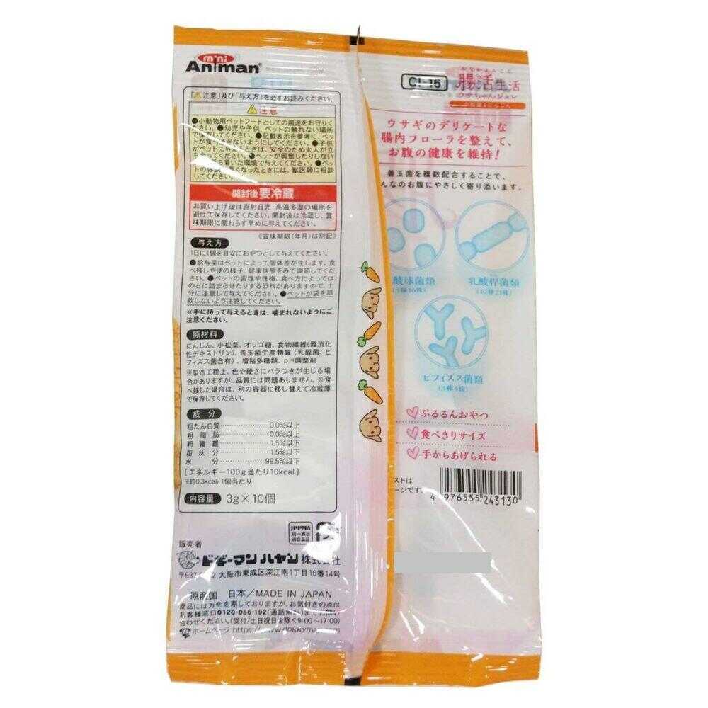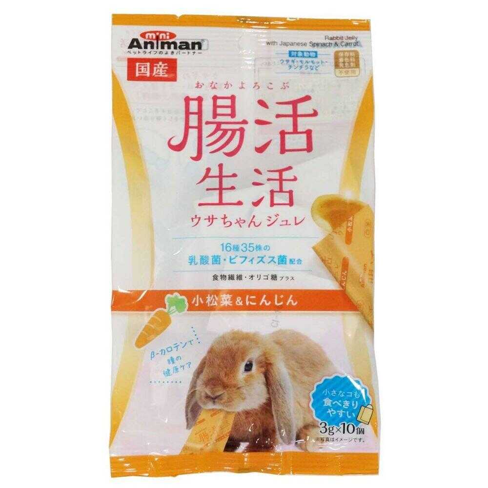 ●腸内フローラにいる細菌は個体差により異なるため、みんなのお腹にやさしく寄り添えるよう、複数の乳酸菌、ビフィズス菌(16種35株)を配合しました。 ●善玉菌の栄養素となる成分、食物繊維とオリゴ糖も配合しました。 ●ビタミン、ミネラルが豊富な小松菜をベースに、ウサちゃんの好きなにんじんを使用したジュレ。にんじんに含まれるβ-カロテンで瞳の健康ケア。 ●小さなコも食べきりやすい3g個装。 ●手からあげてコミュニケーションに!ごほうびに! ●1個当たり約0.3kCal ●ウサギ、モルモット、チンチラなどにオススメです。 ●保存料、着色料、発色剤不使用。