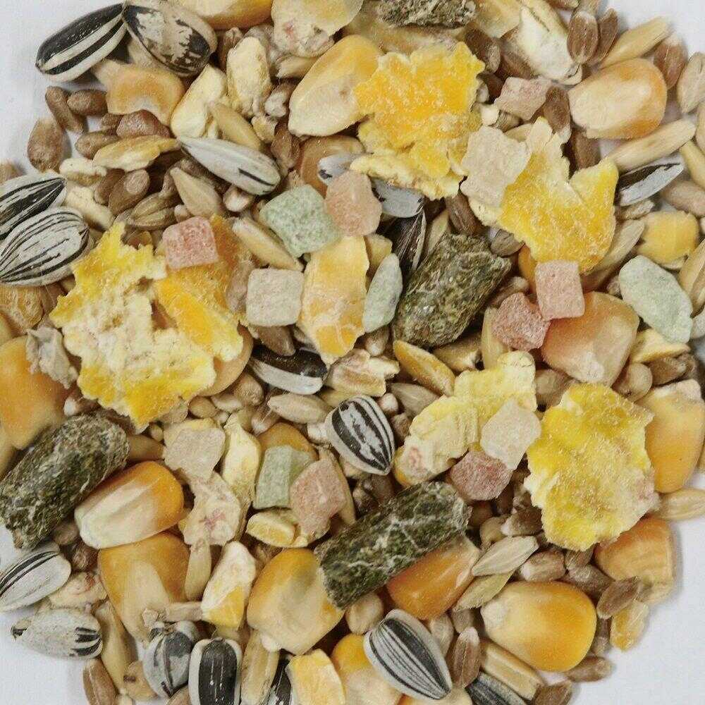 とうもろこし、小麦、大麦、オート麦、マイロ、ひまわりの種、アルファルファ、果物類(パパイヤ、キウイ、パイナップル、りんご)、糖類、キヌア、クエン酸、香料、着色料(青1、黄4)、保存料(亜硫酸塩)
