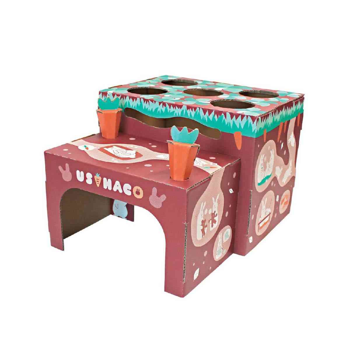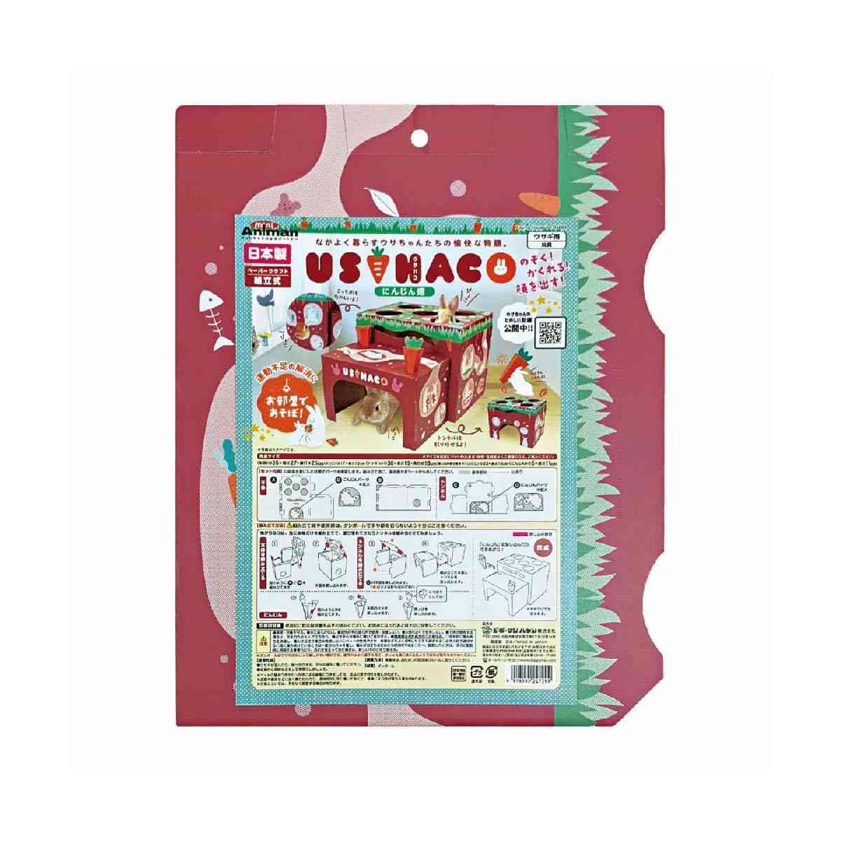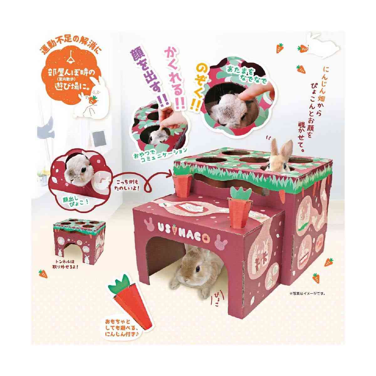 ●なかよく暮らすウサちゃんたちのイラストがかわいい、にんじん畑をイメージしたダンボール製のおもちゃ。組み立て式。 ●安心して隠れられることはもちろん、上面や側面の穴から顔をのぞかせたりもできる。運動不足解消に、お部屋で遊べる。 ●ウサハコからぴょこっと顔を出したときに頭をなでなでしたり、おやつをあげたりして、コミュニケーションにもなる。 ●トンネル部分は取り外しが可能、おもちゃとしても遊べるにんじん付。 ●のぞいたりする穴がいっぱい。いろいろ遊べてストレス解消とコミュニケーションに。
