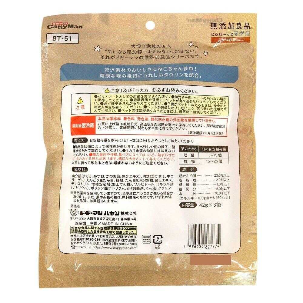 ●保存料、着色料、発色剤、酸化防止剤不使用。 ●上質なマグロにかつお節の香りと旨みをプラス。 ●健康な瞳の維持にうれしいタウリンを配合。 ●しっとりソフトな食感にこだわった、ジューシーな味わい。 ●グレインフリー。 ●大切な家族だから気になる添加物は使わない、加えない。それがドギーマンの無添加良品シリーズです。 ●2ヶ月未満の幼猫には与えないでください