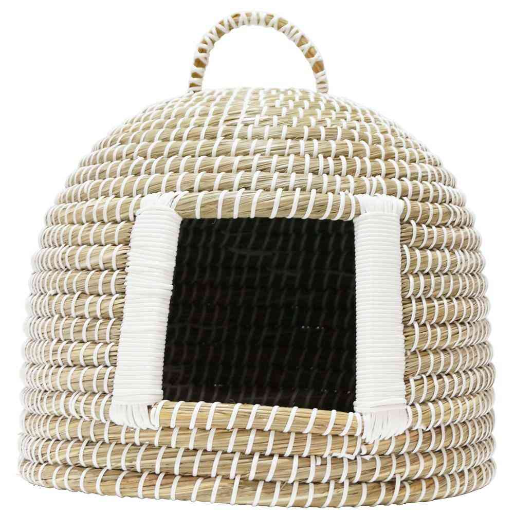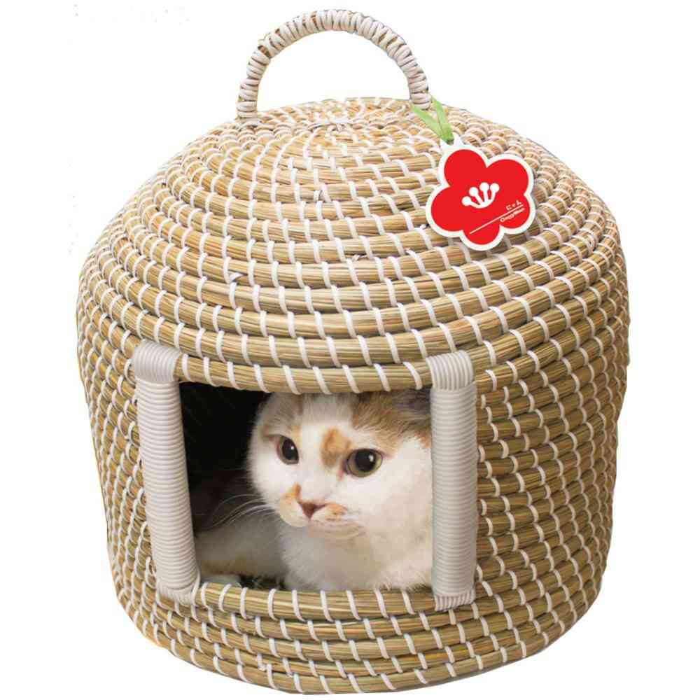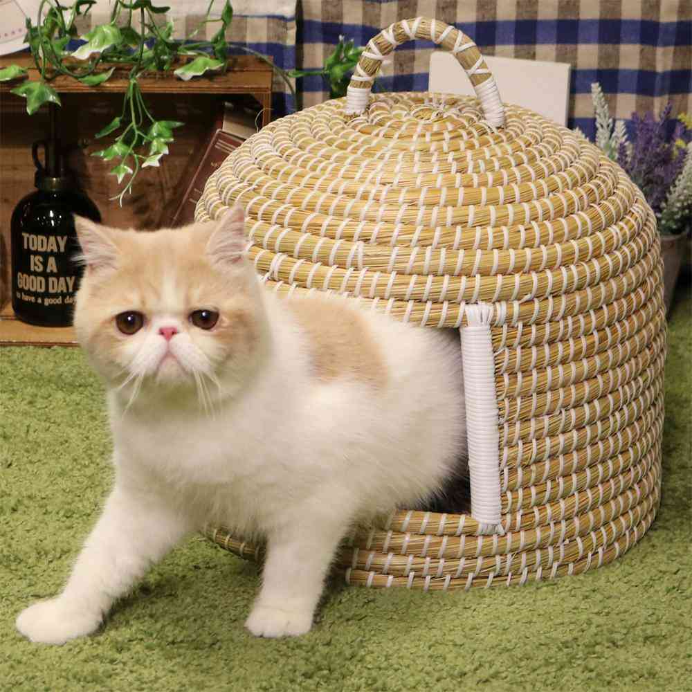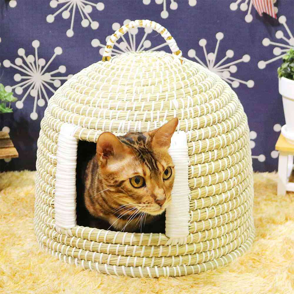 カイザ草を使って、ひとつひとつ丁寧に手編みで作りました。隠れ家気分で過ごせるちょうどよい広さです。うちのコのお名前が入れられる「お名前タグ」つき。世界にひとつ、自分だけのちぐらでいい夢を・・・。