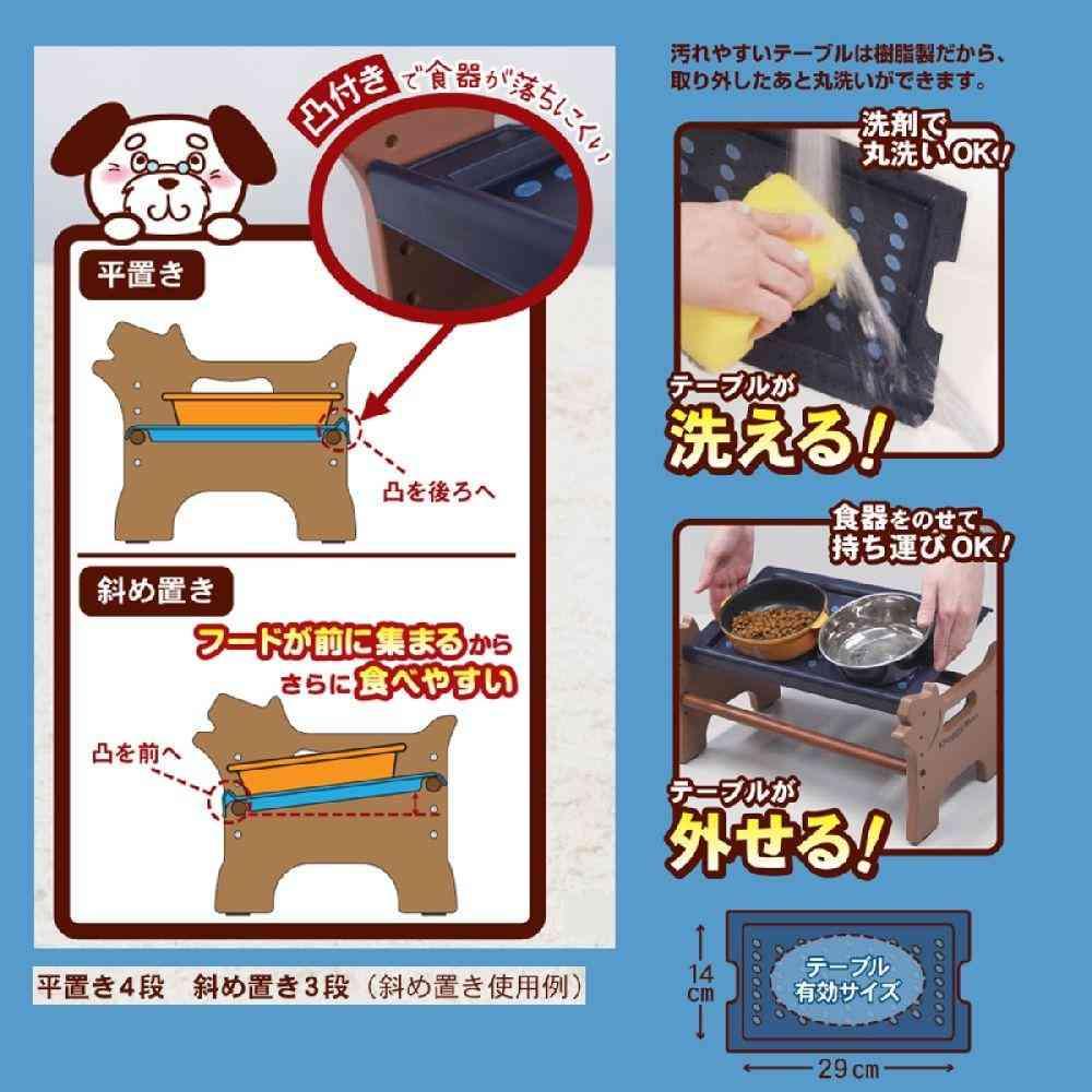 樹脂製でお手入れが簡単「外せる!」「洗える!」テーブル。 すべり止め付きで食器をホールド。 平置きと斜め置きが選べるので、食べ方に合わせてセットできる。 斜め置きにすれば、フードが前に集まるので食べやすい。 テーブルに突起が付いているので食器が落ちにくい。 平置き時は突起を後ろへ(後ろに落ちにくい)、斜め置き時は突起を前へ(前に落ちにくい)。 トレーに食器を載せたまま移動できます。 高さは7・9・11・13cmに調節できます。
