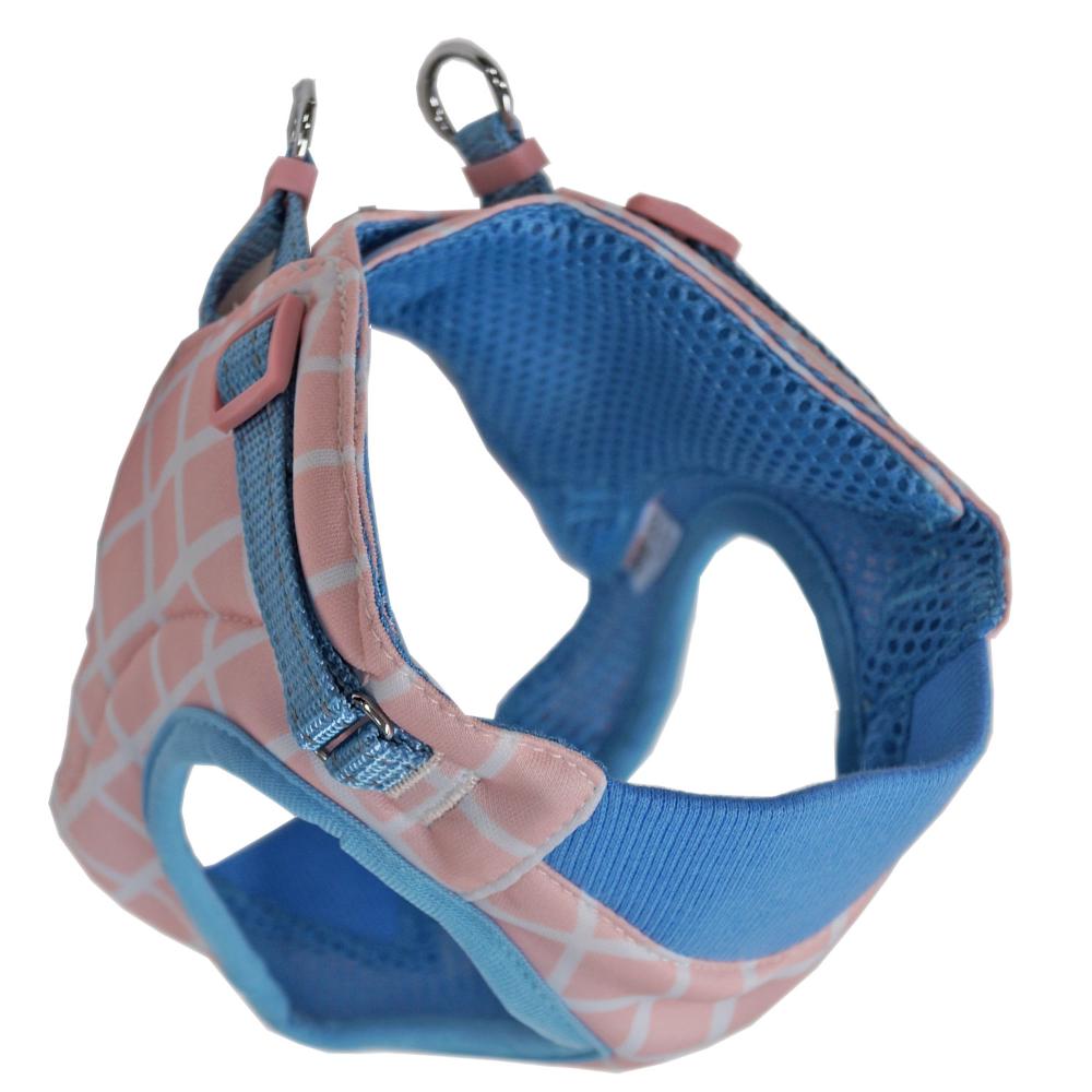 わんちゃんの体をやさしく包み込む、ソフトタイプのおしゃれなハーネス。胸元の伸縮生地で引張時の衝撃を吸収、内側はクッション性のあるメッシュ生地でムレにくく、やさしい肌ざわり。反射テープが夜道で光って安心・安全です。お散歩の中で出会うワクワクをテーマにかわいい雑貨風テキスタイル柄をデザインに取り入れています。足を通して背中のマジックテープでぴったりフィットの簡単装着。余端はすっきり収納。