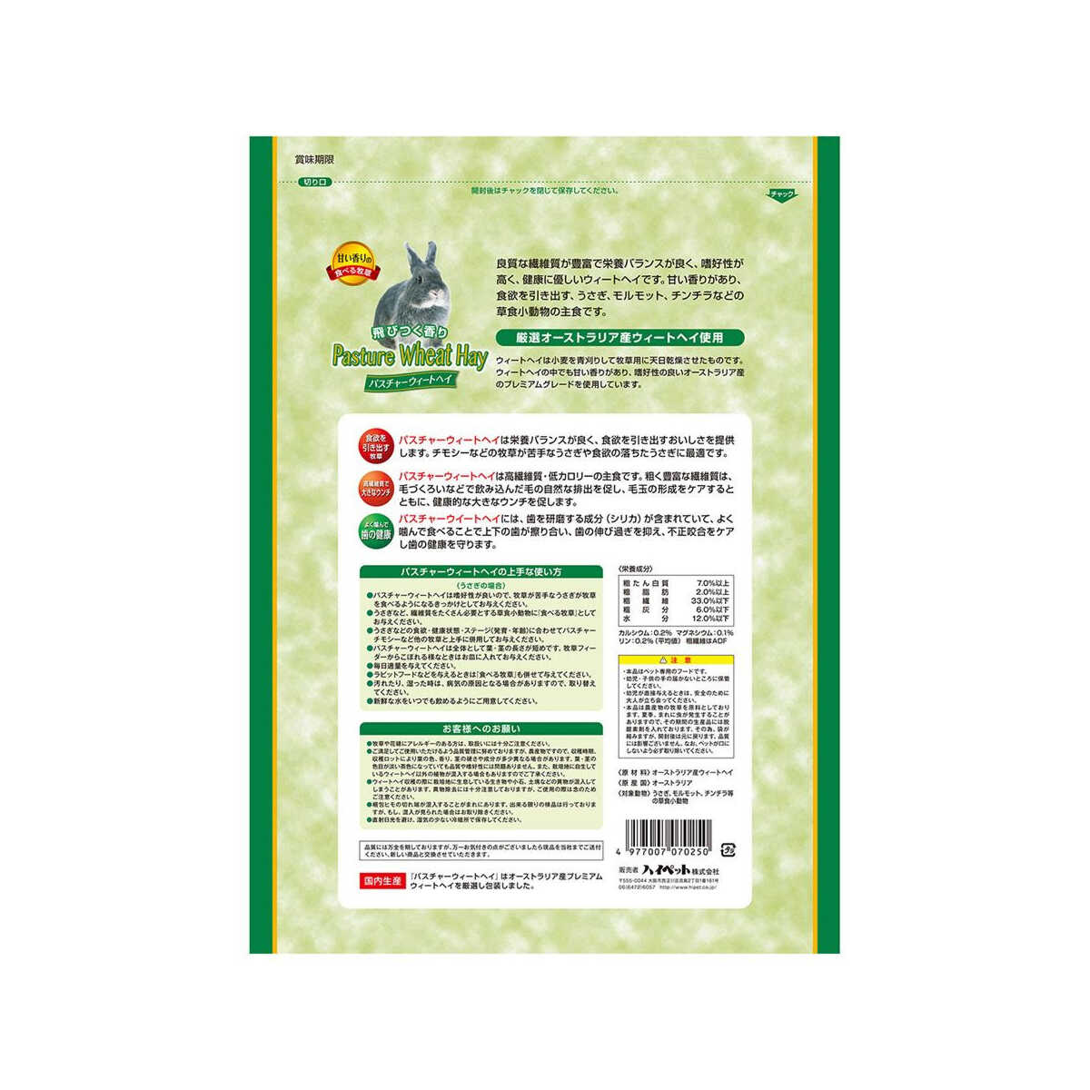 オーストラリア産ウィートヘイ 粗たんぱく質7.0%以上、粗脂肪2.0%以上、粗繊維33.0%以下、粗灰分6.0%以下、水分12.0.%以下