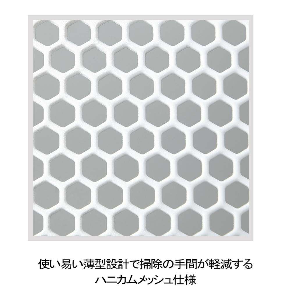 使い易い薄型設計で掃除の手間が軽減するハニカムメッシュ仕様。成形部分は長期に渡り清潔にお使い頂ける抗菌成分を配合。底にはフローリングに置いても使える滑り止め機能付き。
