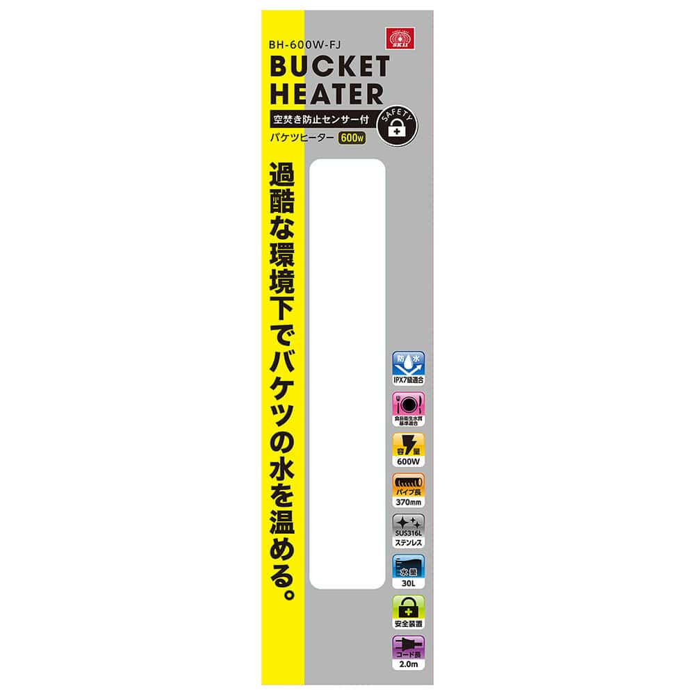 安全・安心。過昇防止センサー付きバケツヒーターです。 内装・土木建築現場、アウトドアレジャー等で、バケツの水を温める電熱式ヒーター。 温度が一定以上になると電源を切る過昇防止センサー付きで空焚きを防止します。 三本脚でバケツの底部にヒーターが接地することを防ぎ、バケツ内での安定感が高くなります。 パイプ部分はステンレス製でサビにくく、お手入れ、保管がラクです。 最低、最高水位線が本体パイプにマークされているため、消えてしまったりはがれてしまう心配がありません。 フック部分は可動式のため、バケツのサイズに合わせて調整が可能です。 ●定格電圧:AC100V(50/60Hz)。 ●消費電力:600W。 ●最大水量:30L。 ●電源コード:2m(アース線あり)。 ●温度過昇防止装置(空焚き防止)付き。 ●PSEマーク認証。