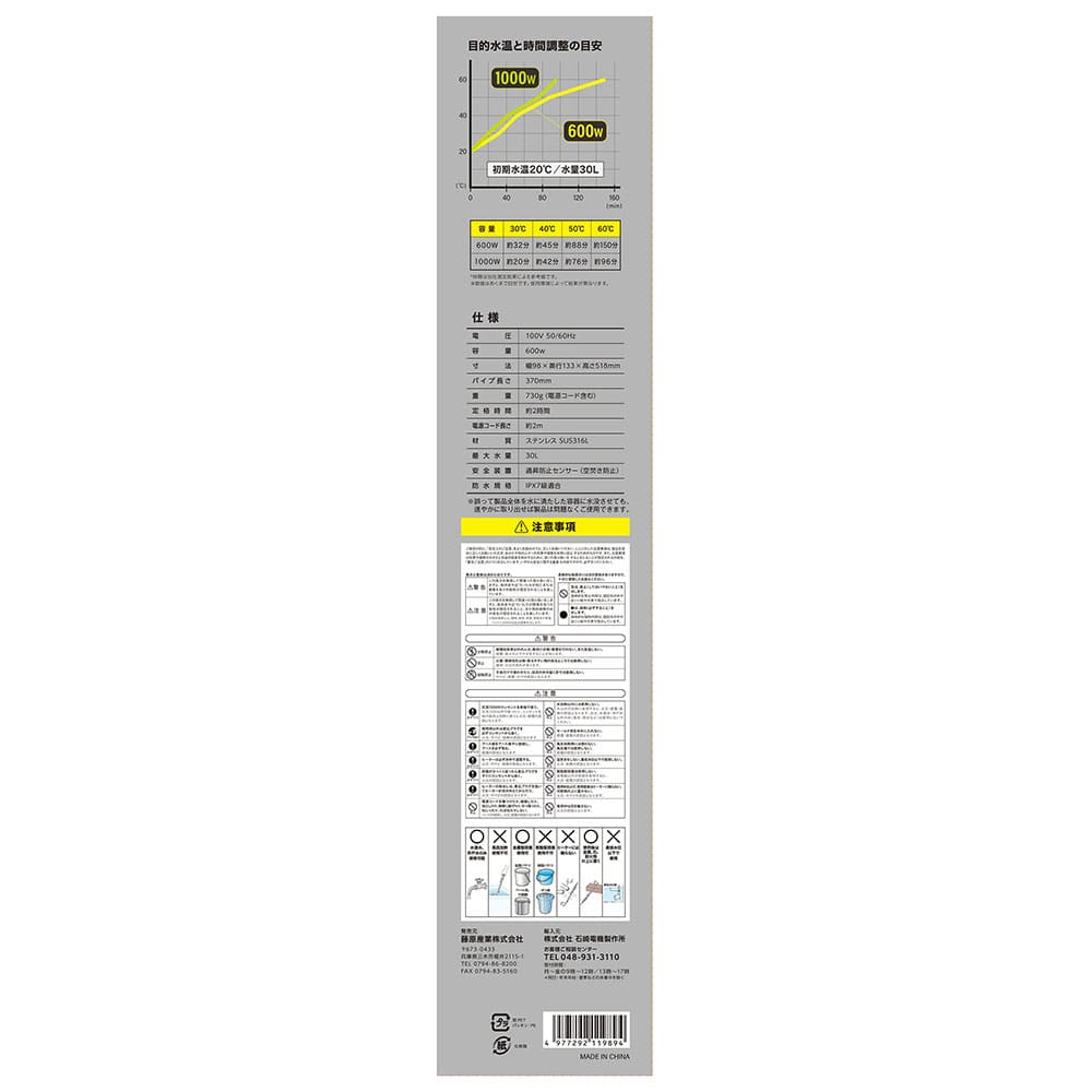 商品パッケージに記載されている「安全上の注意」を必ずご確認いただき、正しくご使用ください。 修理技術者以外の方は絶対に分解・修理・改造を行わないでください。火薬・揮発性引火物・燃えやすいもののあるところでは使用しないでください。子供だけ使わせたり、幼児の手の届く所では使用しないでください。 交流100Vのコンセントを単独でご使用ください。火災、感電の原因となります。使用時以外は差込プラグを必ずコンセントから抜いてください。アース線をアース端子に接続しアースを取ってください。ヒーターは必ず水中で通電してください。使用中バケツ容器が転倒するなどした場合はすぐに差込プラグをコンセントから抜き、使用を中断してください。
