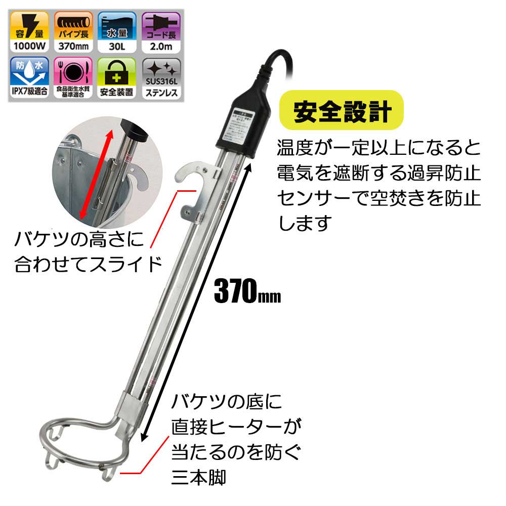 安全・安心。過昇防止センサー付きバケツヒーターです。 内装・土木建築現場、アウトドアレジャー等で、バケツの水を温める電熱式ヒーター。 温度が一定以上になると電源を切る過昇防止センサー付きで空焚きを防止します。 三本脚でバケツの底部にヒーターが接地することを防ぎ、バケツ内での安定感が高くなります。 パイプ部分はステンレス製でサビにくく、お手入れ、保管が楽です。 最低、最高水位線が本体パイプにマークされているため、消えてしまったりはがれてしまう心配がありません。 フック部分は可動式のため、バケツのサイズに合わせて調整が可能です。 ●定格電圧:AC100V(50/60Hz)。 ●消費電力:1000W。 ●最大水量:30L。 ●電源コード:2m(アース線あり)。 ●温度過昇防止装置(空焚き防止)付き。 ●PSEマーク認証。