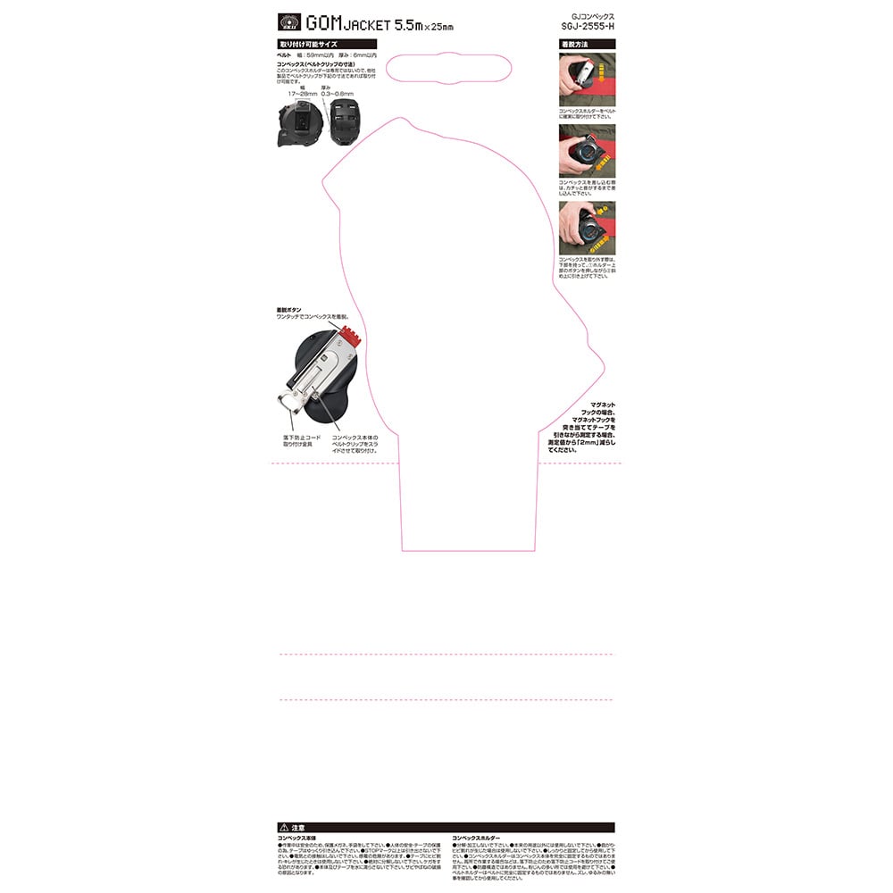 携帯に便利なコンベックスホルダー付です。 長さの測定。 衝撃に強いゴムジャケットカバー付です。 一人での測定に便利な強力マグネット付フックです。 目盛は耐摩耗に強い、ナイロンコートテープです。 信頼のJIS1級目盛テープです。 ●テープ幅:25mm。 ●テープ長さ:5.5m。 ●テープ目盛:JIS1級、両面印刷。 ●テープ:ナイロンコート。 ●コンベックスホルダー付。