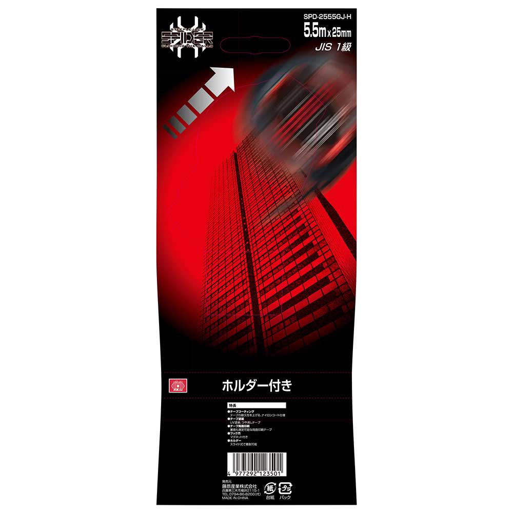 携帯に便利なコンベックスホルダー付です。 長さの測定。 衝撃に強いゴムジャケットカバー付です。 一人での測定に便利な強力マグネット付フックです。 携帯・収納に便利なコンベックスホルダー付です。 目盛は耐摩耗に強い、ナイロンコートテープです。 信頼のJIS1級目盛テープです。 ●テープ幅:25mm。 ●テープ長さ:5.5m。 ●テープ目盛:JIS1級、両面印刷。 ●テープ:ナイロンコート。 ●コンベックスホルダー付。