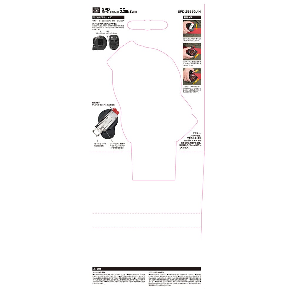 コンベックスホルダーは、コンベックス本体を完全に固定するものではありません、高所で作業される際などは必ず落下防止コードを取り付けてください。分解、加工しないで下さい。本来の用途以外では使用しないで下さい。テープなどに、曲り、ひび割れが生じた際は使用しないで下さい。 コンベックスホルダーはベルトに完全に固定するものではありません。ゆるみの無い事を十分にご確認いただいてから使用してください。防塵構造ではありません、粉じんの多い所では使用しないで下さい。使用時は安全の為、保護メガネなどを着用してください。テープはゆっくりと引き込んでください、けがの恐れがあります。STOPマーク以上は引き出さないで下さい。 電気との接触はしないで下さい。感電の恐れがあります。テープバネは水に濡らさないで下さい。サビやバネ破損の原因になります。