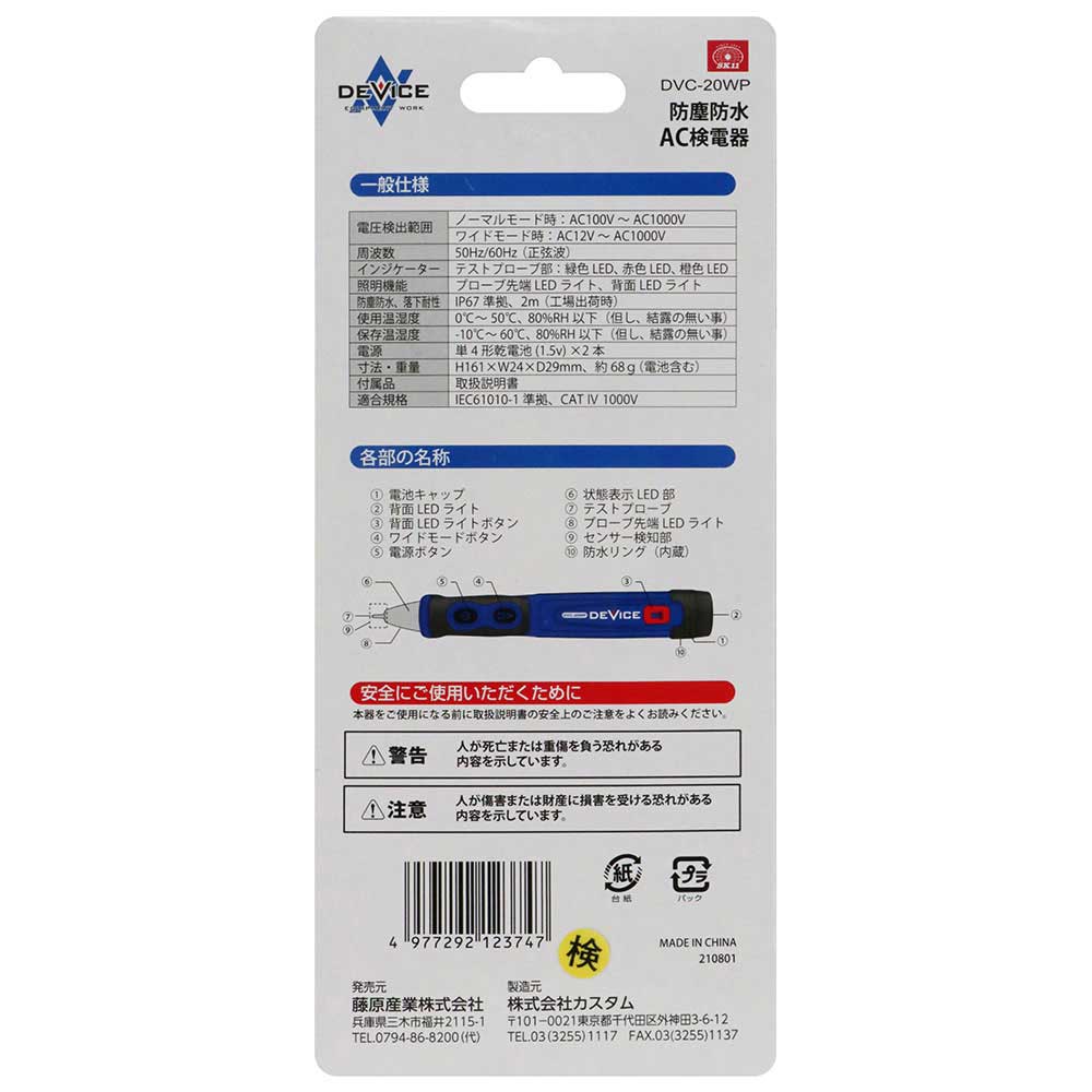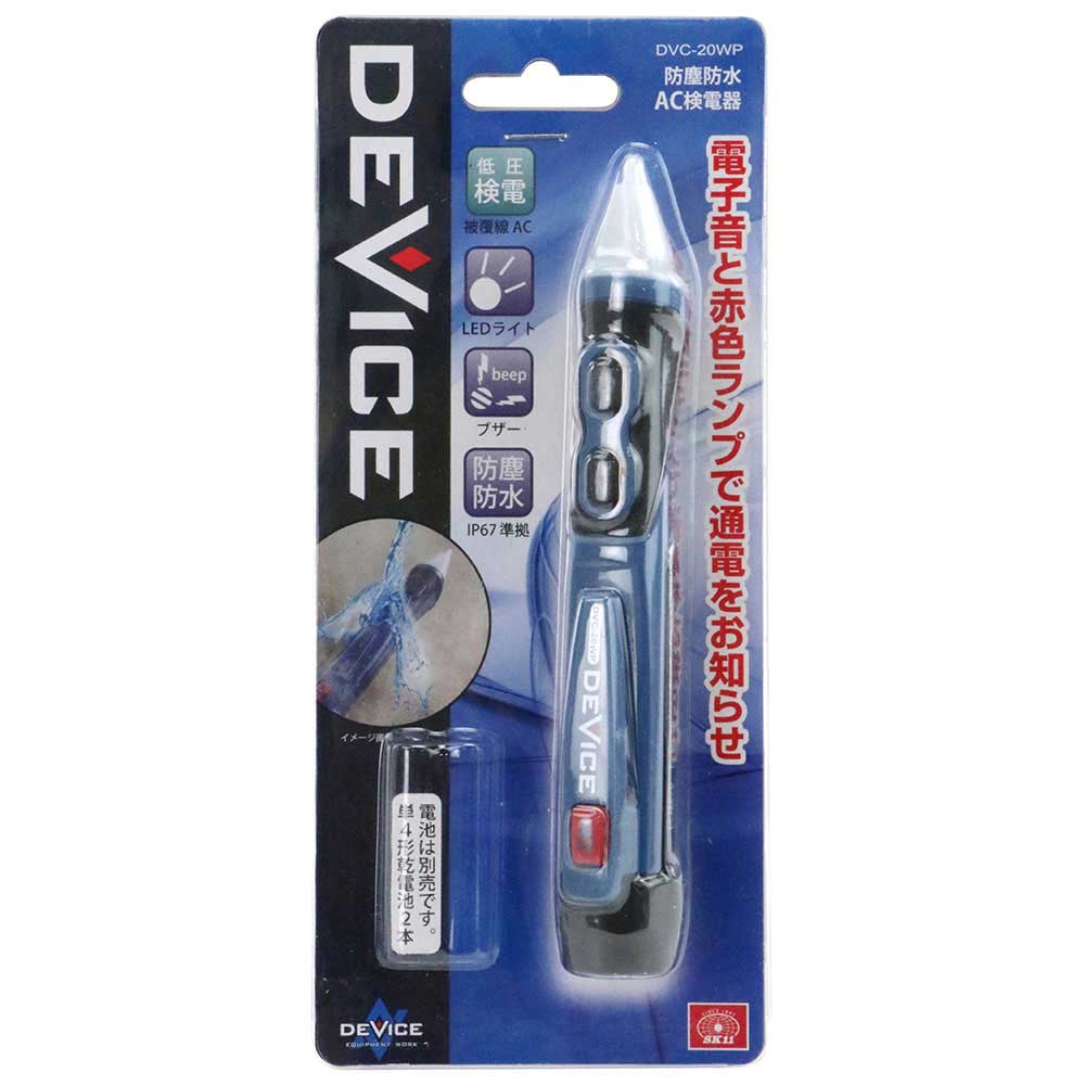 IP67規格に準拠した防塵防水構造ですので、突然の雨や水没、埃の多い過酷な現場でも安心して使用できます。 ACの通電チェック。 2mの高さからの落下にも耐える耐落下性能があります。 検電状態を音とLEDでお知らせします。 暗い所で便利なLEDライトをプローブ先端と製品底面の2か所に装備しています。 約12Vの低電圧から検出可能なワイドモード付きです。 電池は使いやすい単4×2本モデルです。 ●ノーマルモード時AC検出電圧:100~1000V(50~60Hz)。 ●ワイドモード時AC検出電圧:12~1000V。 ●使用温湿度:0~+50度C・80%RH以下(結露がないこと)。 ●保存温湿度:-10~+60度C・80%RH以下(結露がないこと)。 ●電源:単4形乾電池×2本(別売)。 ●規格準拠:IEC61010-1_CAT.IV_1000V。 ●校正:不可。