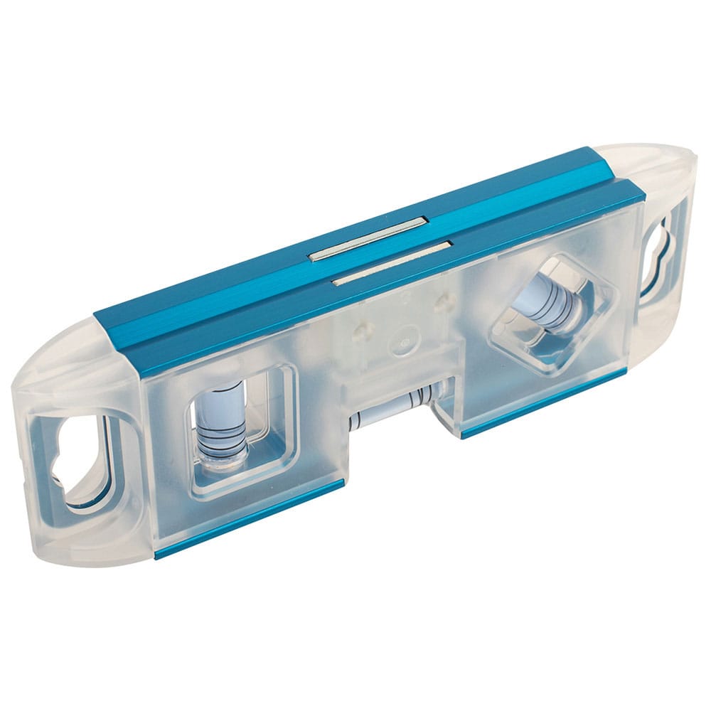 大型シャックル付きの水平器です。 水平・垂直・45度の測定。 大型シャックル付きで携帯に便利です。 シャックル部分も特殊樹脂カバーに覆われているため、収納ケースやポケットとうに入れやすい形状です。 強力マグネット付きで鉄骨、単管パイプなどの測定に便利です。 測定基準面V溝付きでパイプ等の測定に便利です。 蓄光付きで、明るい所で光を蓄積して暗い所で数分間発光します。 ●気泡管:4本線アクリル気泡管(水平・垂直・45度)。 ●気泡管色:ブルー。 ●感度:0.50mm/m=0.0286度。 ●精度:±1.00mm/m=±0.0573度以内。