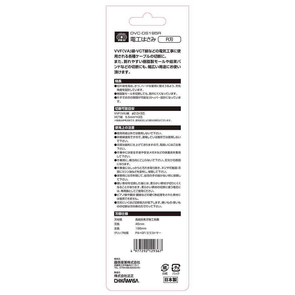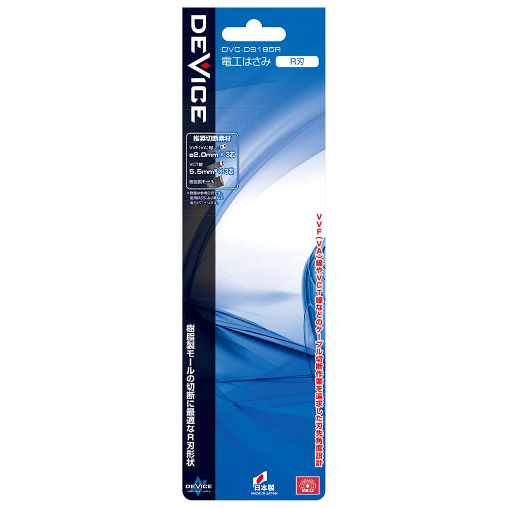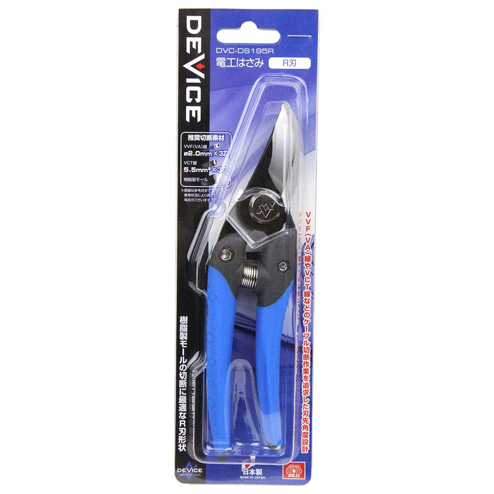 樹脂製モールの切断に最適なR刃形状です。 VVF(VA)線・VCT線などの電気工事に使用される各種ケーブル切断。 VVF(VA)線やVTC線などのケーブル切断作業を追求した刃先角度設計です。 樹脂製モールを切断しても、割れにくくなっています。 結束バンドなどの切断など幅広い用途にお使い頂けます。 片手で刃の開閉が簡単に出来ます。 ●刃の形状:R刃。 ●全長:195mm。 ●刃長:45mm。 ●切断可能目安:(VVF(VF)線)径2.0×3芯・(VCT線)5.5mm2×3芯。