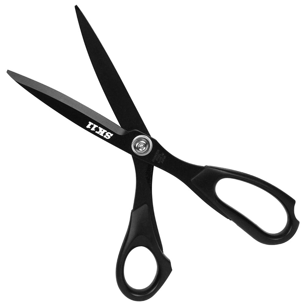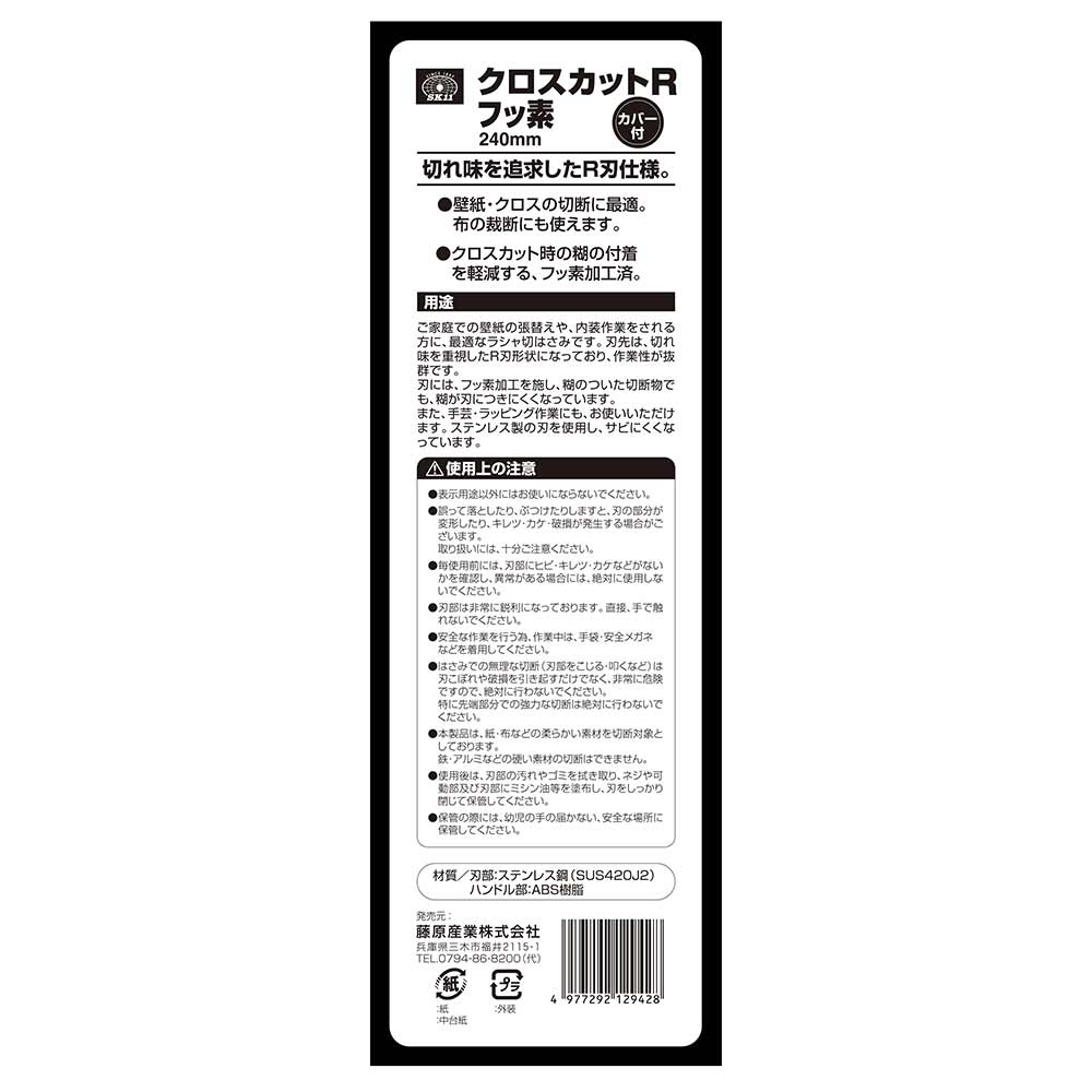 壁紙・クロスの切断に最適な鋏です。 壁紙・クロスの張替え時などの切断作業。 布の裁断・ラッピング・手芸作業にも使用できるラシャ切はさみです。 刃先は、切れ味重視したR刃形状になっており、作業性が抜群です。 クロスカット時の糊の付着を軽減するフッ素加工済です。 サビにくいステンレス製の刃です。 ●全長:240mm。 ●刃部:R刃仕様・フッ素加工。 ●カバー付き。
