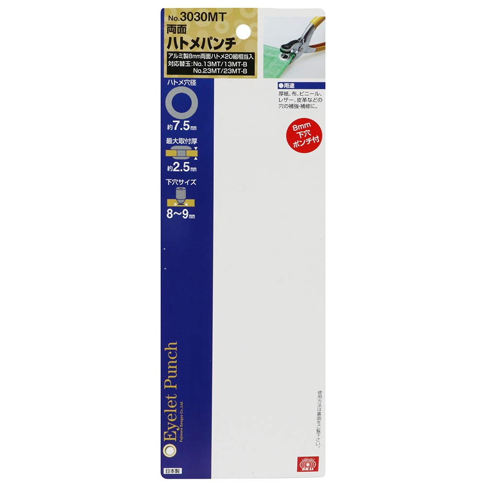 厚紙・布・ビニール・レザー・皮革などの穴の補強・補修作業に最適な両面ハトメパンチです。 厚紙・布・ビニール・レザー・皮革などの穴の補強・補修作業。 ハトメを取り付けるのは、単なるおしゃれにとどまらず、穴の補強をすることで、品物を長持ちさせるのに役立ちます。 アルミ製・真鍮製の8mmのハトメ玉が使用できます。 ●ハトメ穴径:約7.5mm。 ●最大取付厚:約2.5mm。 ●下穴サイズ:8~9mm。 ●対応替玉:NO.13MT/NO.13MT-B/NO.13MT-P。 ●NO.23MT/NO.23MT-B。 ●付属品:アルミ製両面ハトメ8mm20組相当入。