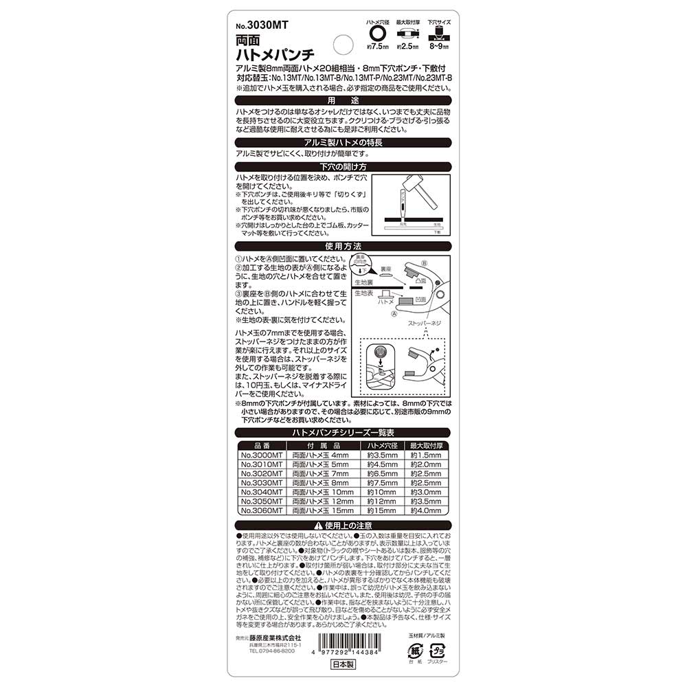 ご使用の際には、ハトメの表裏・取り付ける材料の表裏などにご注意下さい。特に、ハトメ玉の表裏を間違えると、うまくかしめられることが出来ず、ハトメパンチ本体・玉・材料などにキズをつける場合もあります。 取り付ける材料の材質によって、取り付け厚が変わることがあります。あらかじめご了承ください。 その他、注意事項につきましては、パッケージ裏などに記載の内容をよくご確認頂きまして、ご使用ください。また、パッケージは保管し、ご使用時に確認が取れるようにしてください。