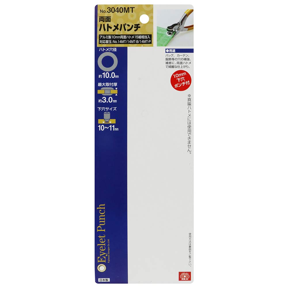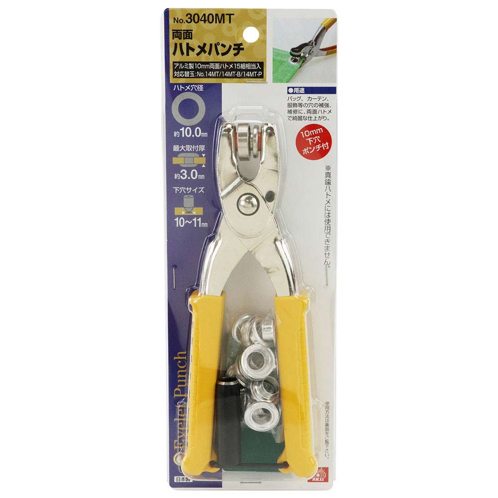 厚紙・布・ビニール・レザー・皮革などの穴の補強・補修作業に最適な両面ハトメパンチです。 厚紙・布・ビニール・レザー・皮革などの穴の補強・補修作業。 ハトメを取り付けるのは、単なるおしゃれにとどまらず、穴の補強をすることで、品物を長持ちさせるのに役立ちます。 アルミ製の10mmのハトメ玉が使用できます。 真鍮製ハトメ玉は使用できません。 ●ハトメ穴径:約10mm。 ●最大取付厚:約3.0mm。 ●下穴サイズ:10~11mm。 ●対応替玉:NO.14MT/NO.14MT-B/NO.14MT-P。 ●付属品:アルミ製両面ハトメ10mm15組相当入。