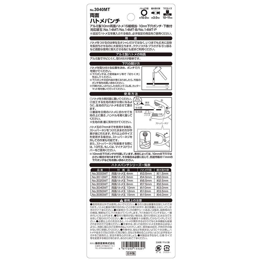 ご使用の際には、ハトメの表裏・取り付ける材料の表裏などにご注意下さい。特に、ハトメ玉の表裏を間違えると、うまくかしめられることが出来ず、ハトメパンチ本体・玉・材料などにキズをつける場合もあります。 取り付ける材料の材質によって、取り付け厚が変わることがあります。あらかじめご了承ください。 その他、注意事項につきましては、パッケージ裏などに記載の内容をよくご確認頂きまして、ご使用ください。また、パッケージは保管し、ご使用時に確認が取れるようにしてください。