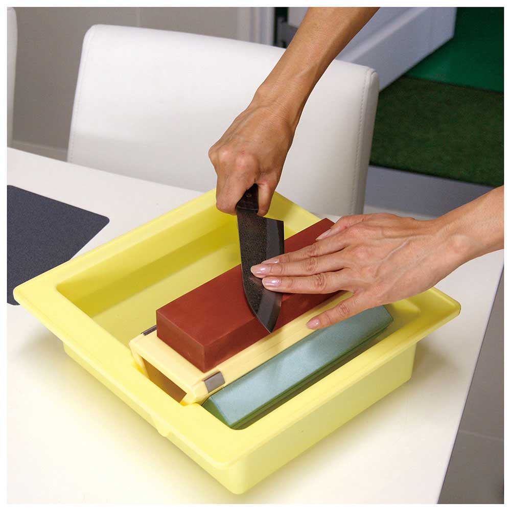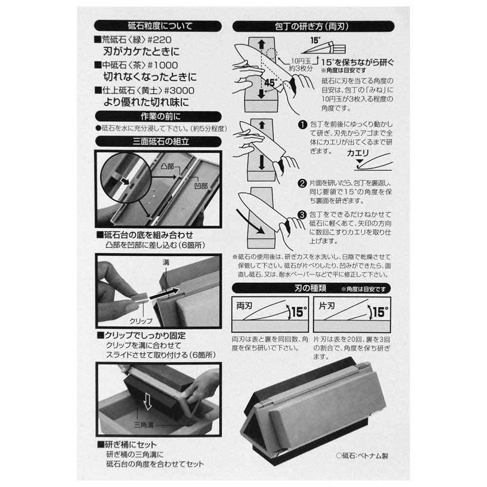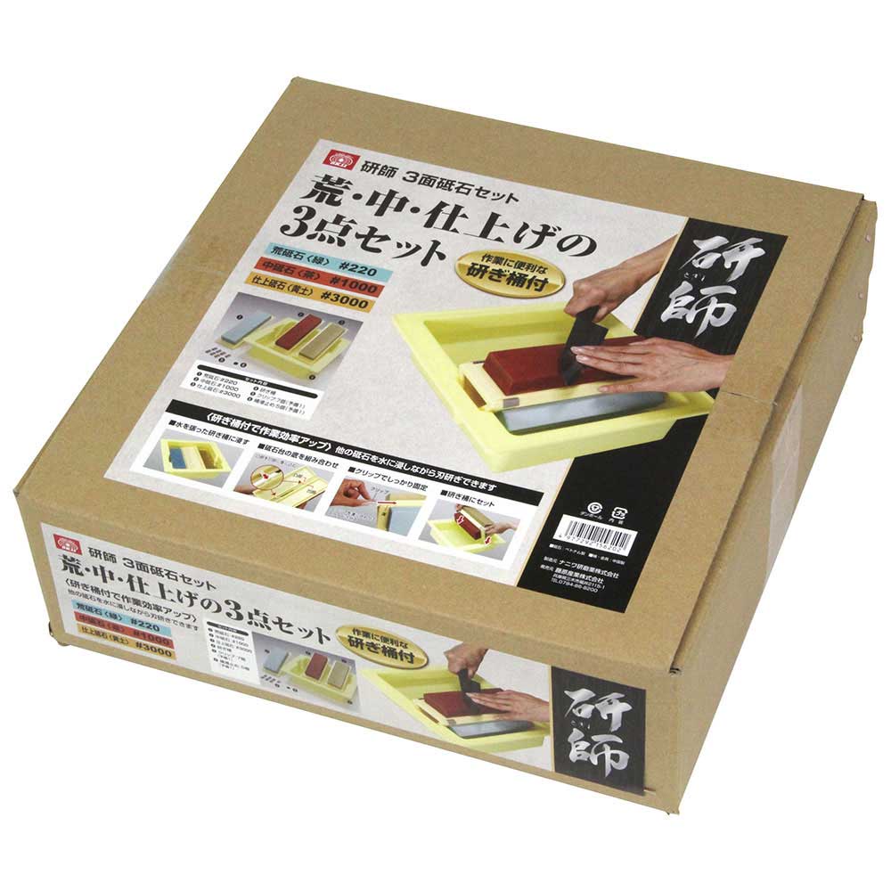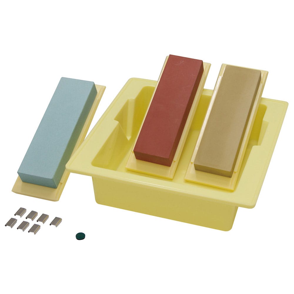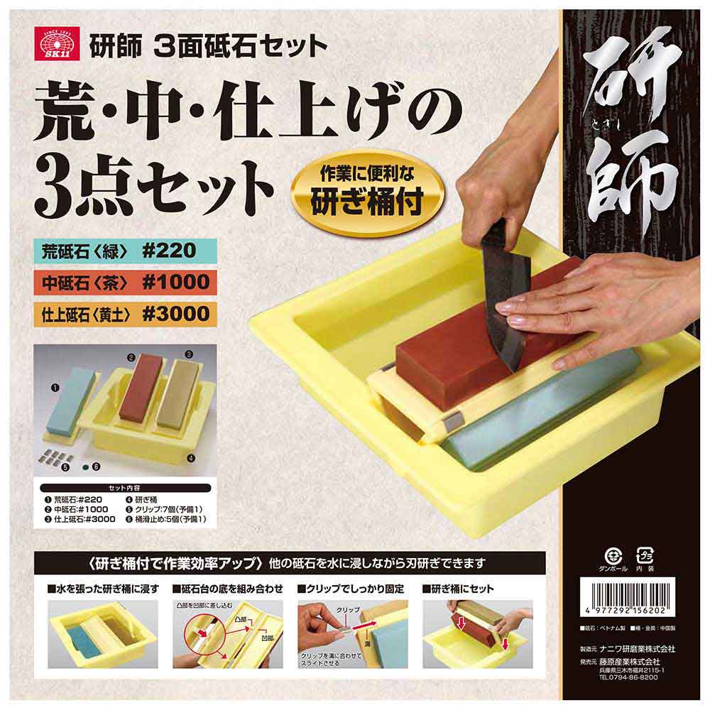 荒・中・仕上げの3種類の砥石のセット品です。 刃研ぎ。 刃物の状態に合わせて、使う砥石を選択できます。 水をつけながらの作業を楽に行うため、専用の研ぎ桶がセットになっています。 砥石のセッティングは、クリップ式で簡単になっています。 ●砥石サイズ(PC台含む):約90×250mm。 ●粒度:220・1000・3000番。 ●セット内容:荒砥石(220番)・中砥石(1000番)・仕上砥石(3000番)・研ぎ桶・クリップ7個・桶滑止め5個。