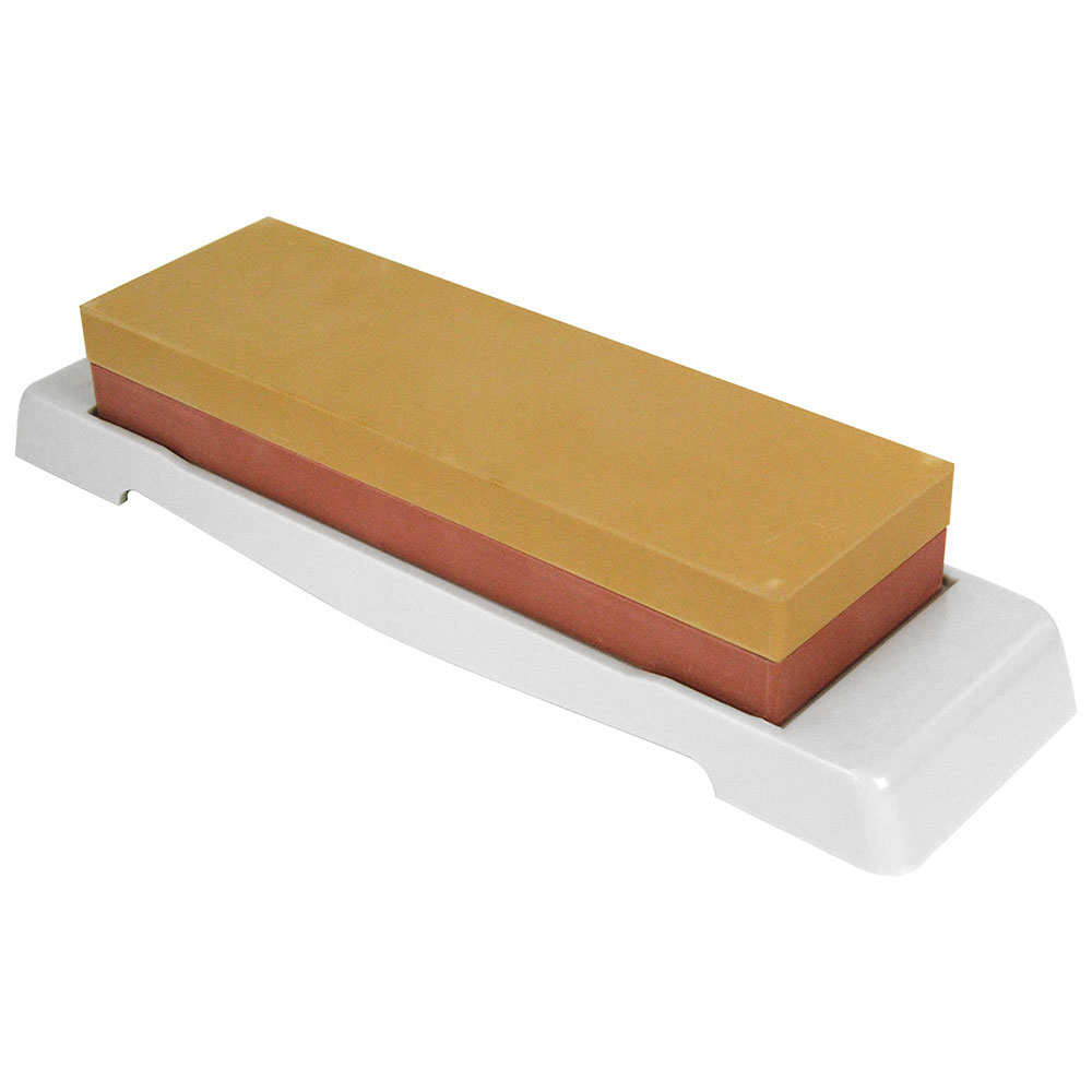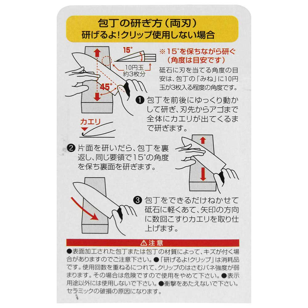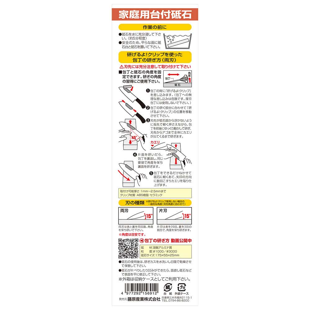 両面使える2役砥石と、包丁を研ぐ角度を固定できる「研げるよクリップ」のセットです。 一般料理包丁・ステンレス包丁などの刃研ぎ。 包丁の背を「研げるよクリップ」に差し込むだけで刃研ぎの際の角度を固定できます。 中仕上げ用・仕上げ研ぎ用があり、1本で2通りに使用出来ます。 中仕上げ用は刃物の切れ味が落ちた時に、仕上げ研ぎ用はより優れた切れ味にするときに使用して下さい。 ●砥石サイズ:175X55X25mm。 ●仕上げ用砥石:3000番。 ●中仕上げ用砥石:1000番。 ●クリップ取付可能厚:1.0~2.5mm。