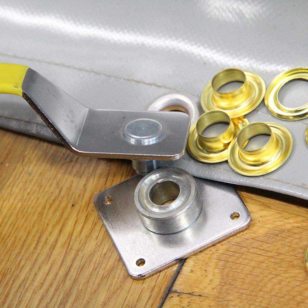 対象物(トラックの幌やシートあるいは製本、服飾等の穴の補強、補修など)に下穴をあけてパンチしてください。下穴をあけてパンチすると、一層きれいに仕上がります。 取付け個所が弱い場合は、取付け部分に丈夫な当て生地をして取付けて下さい。 ハトメの表裏を十分確認してからパンチして下さい。