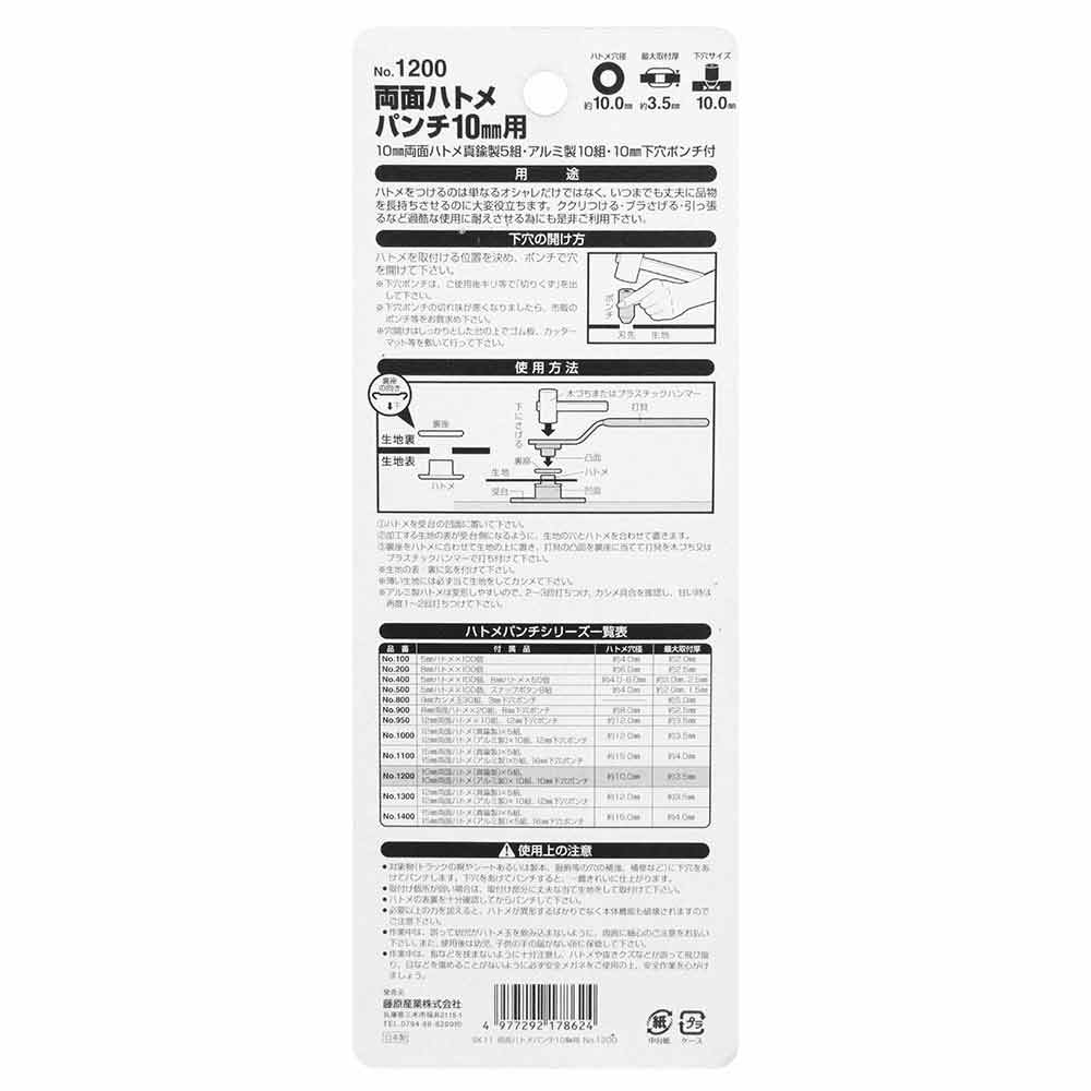 両面ハトメで仕上がりが美しく丈夫になります。 テント・シート等の穴の補強・補修。 ハトメを取り付けることにより、いつまでも丈夫に品物を長持ちさせるのに大変役立ちます。 真鍮製ハトメは強力にカシメられ、幌・シート等の力のかかる物に最適です。 アルミ製ハトメは取付けが簡単でサビにくいのでエプロンや製本に最適です。 ●ハトメ穴径:約10.0mm。 ●最大取付厚:約3.5mm。 ●下穴サイズ:10.0mm。 ●付属品:10mm両面ハトメ(真鍮製5組・アルミ製10組)・10mm下穴ポンチ。
