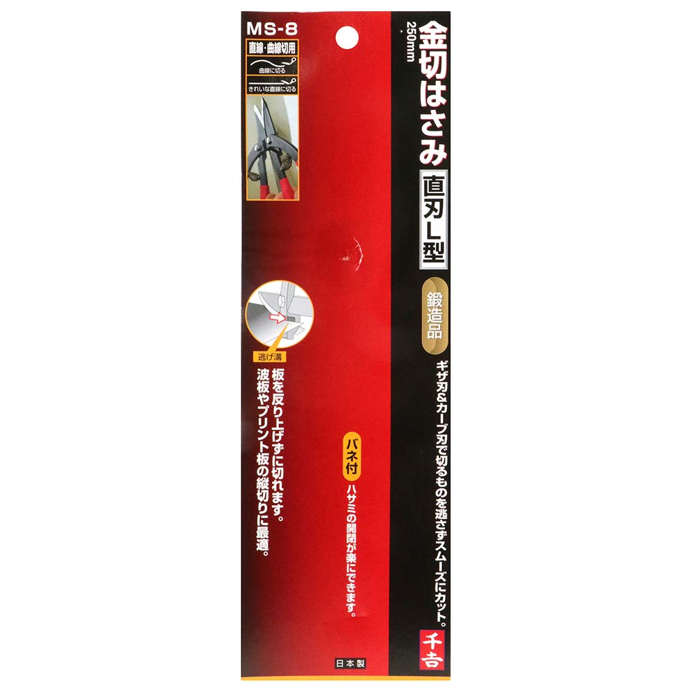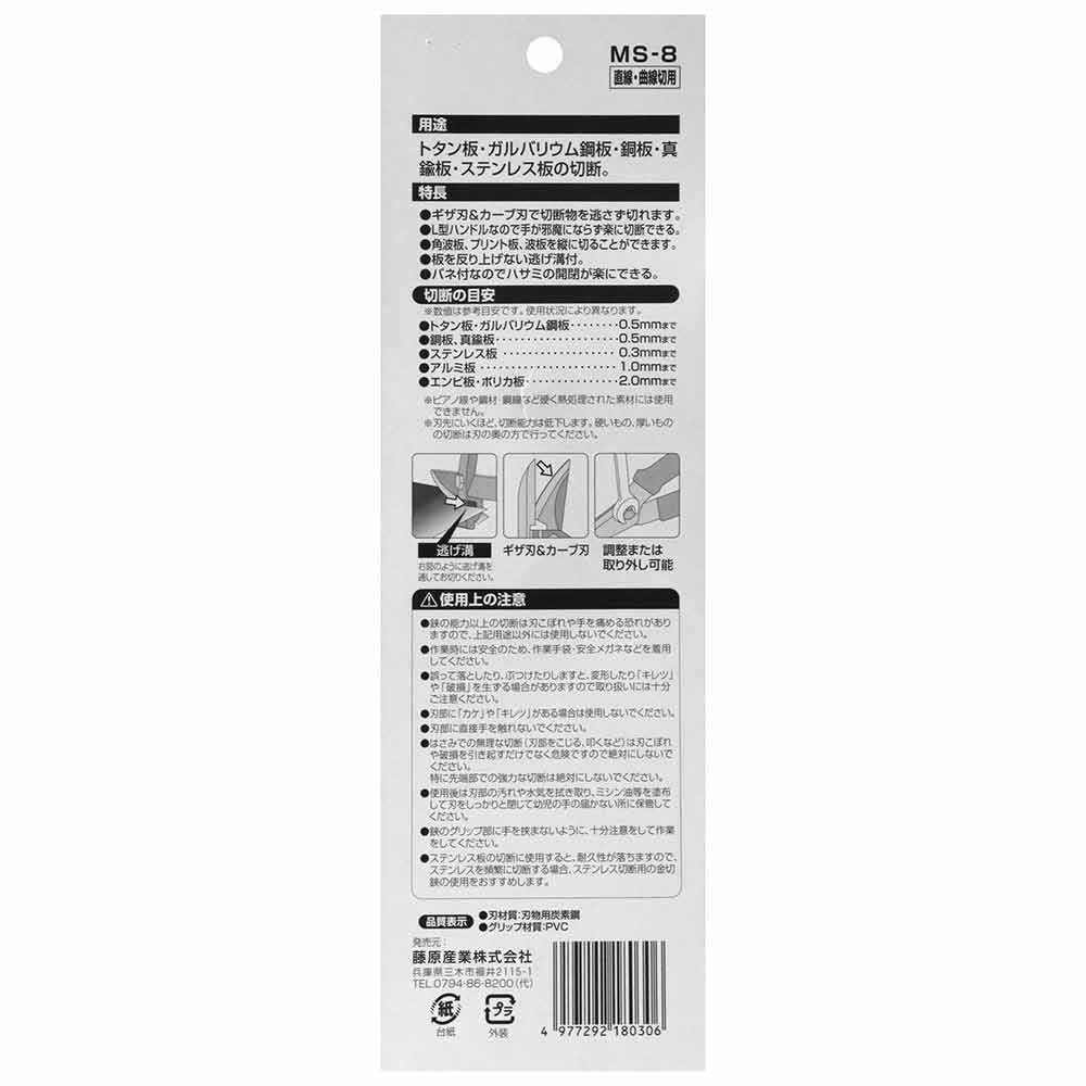 ギザ刃&カーブ刃で切るものを逃さずスムーズにカットできます。 直線・曲線切り。 トタン板・ガルバリウム鋼板・銅板・真鍮板・ステンレス板の切断ができます。 L型ハンドルなので、手が邪魔にならず楽に切断できます。 角波板、プリント板、波板を縦に切ることができます。 板を反り上げない逃げ溝付きです。 バネ付なので、ハサミの開閉が楽にできます。 ●直刃L型。 ●全長:約250mm。 ●切断能力(目安):(トタン板・ガルバリウム鋼板・銅板・真鍮板)0.5mmまで。 ●切断能力(目安):(ステンレス板)0.3mmまで・(アルミ板)1.0mmまで・(エンビ板・ポリカ板)2.0mmまで。