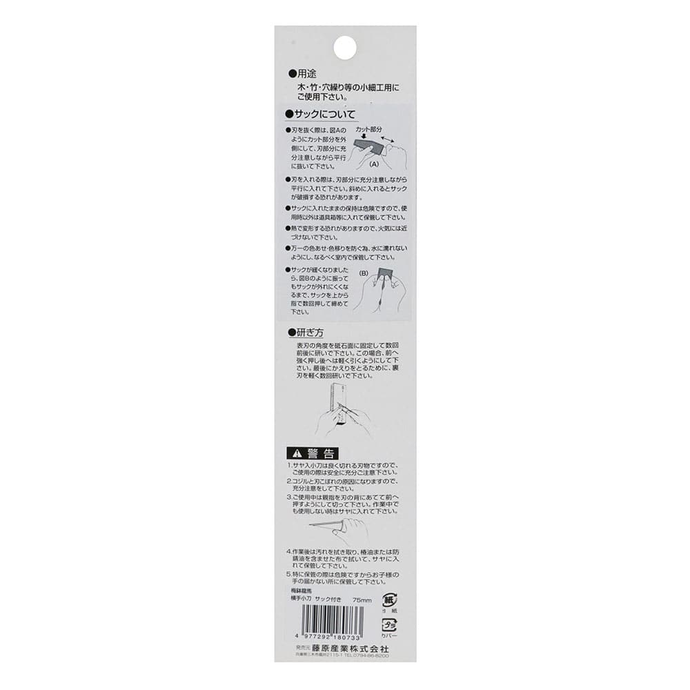 使用用途以外では使用しないでください。刃部は鋭利に仕上げています。取り扱いには、十分に注意してください。サックから小刀を取り出す際や、小刀を収納する際など、刃部に手が触れないように注意してください。 作業前には周囲の安全を確保し、手袋などの安全保護具を必ず着用してください。作業後には、汚れを落し、子供・幼児の手の届かない場所に保管してください。