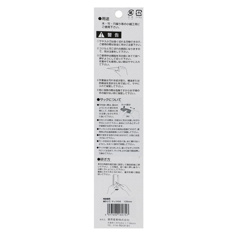使用用途以外では使用しないでください。刃部は鋭利に仕上げています。取り扱いには、十分に注意してください。サックから小刀を取り出す際や、小刀を収納する際など、刃部に手が触れないように注意してください。 作業前には周囲の安全を確保し、手袋などの安全保護具を必ず着用してください。作業後には、汚れを落し、子供・幼児の手の届かない場所に保管してください。