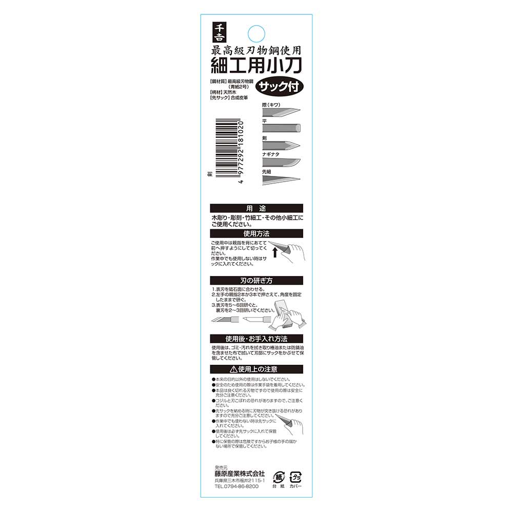 ご使用前に必ず裏面の取り扱い説明をご覧下さい。 細工用小刀は良く切れる刃物ですので、ご使用の際は安全に充分ご注意ください。 コジルと刃こぼれの原因になりますので、充分注意をしてください。