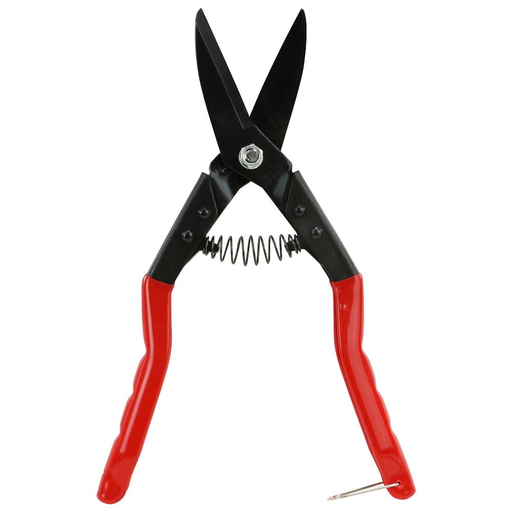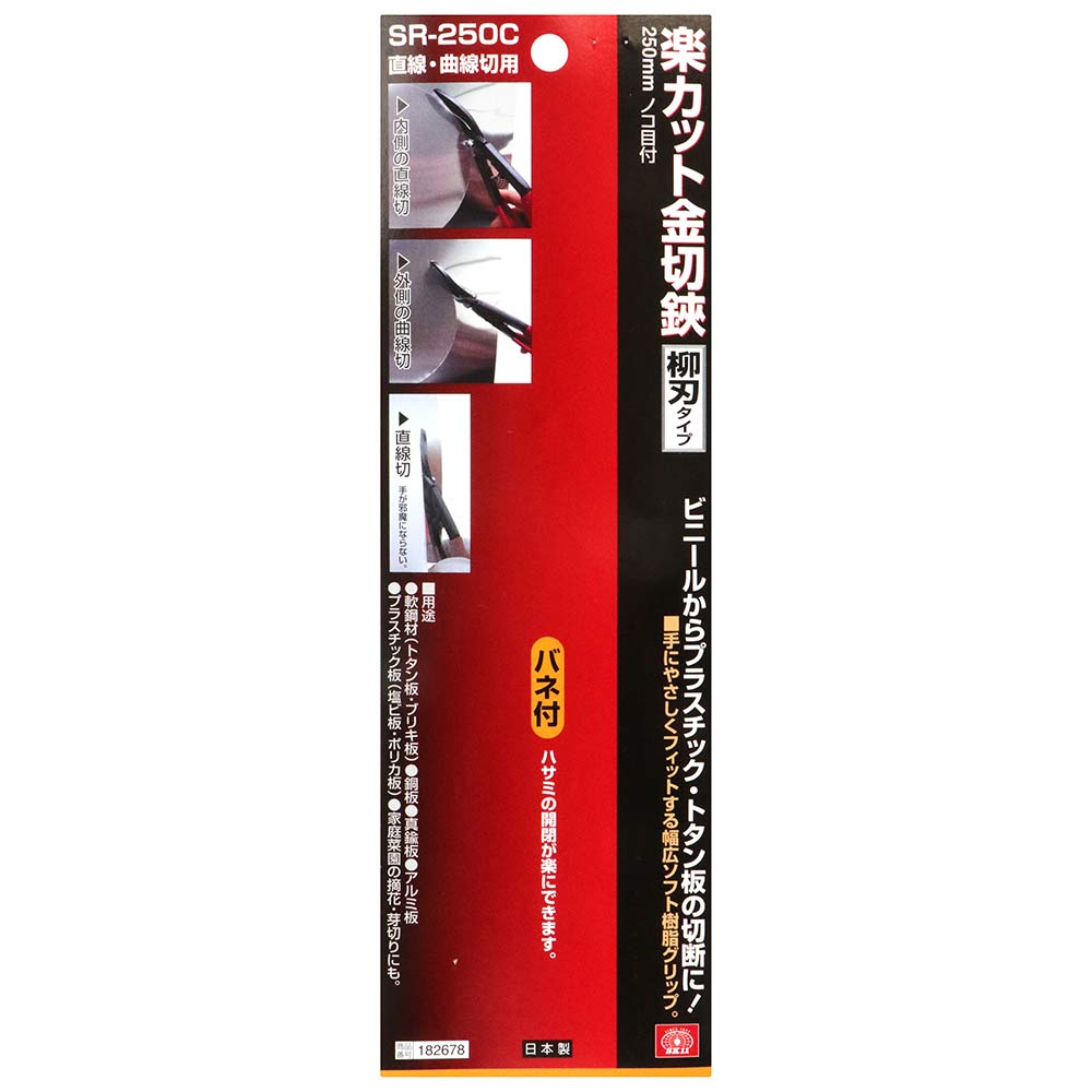 刃が曲がっているので、板を切っても手が邪魔になりくく、直線、曲線が切れる万能タイプです。 軟鋼材、銅板、真鍮板、アルミ板、プラスチック板、家庭菜園の摘花・芽切り。 刃にノコ目があるので対象物がすべりにくいです。 バネ付きで、ハサミの開閉が楽にできます。 カシメ部はボルトを使いスプリング座金の使用により、ナットの締付け調整を自由に変更できます。 ゆるみ止めナットを使用しておりますので、長時間使用している間にナットがゆるむことを防止します。 手にやさしくフィットする幅広ソフト樹脂グリップを採用しています。 ●切断目安:(軟鋼材・銅板・真鍮版)板厚0.5mmまで。 ●切断目安:(アルミニウム)板厚1.0mmまで。 ●切断目安:(プラスチック・ゴム・ビニール)板厚2.0mmまで。 ●刃部焼入硬度:HRC55±1。 ●柄部:アルファゾルコーティング。