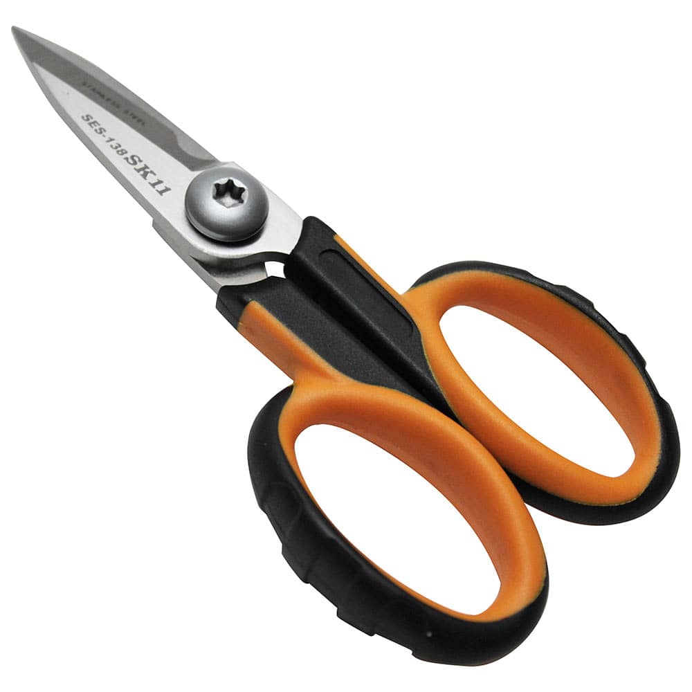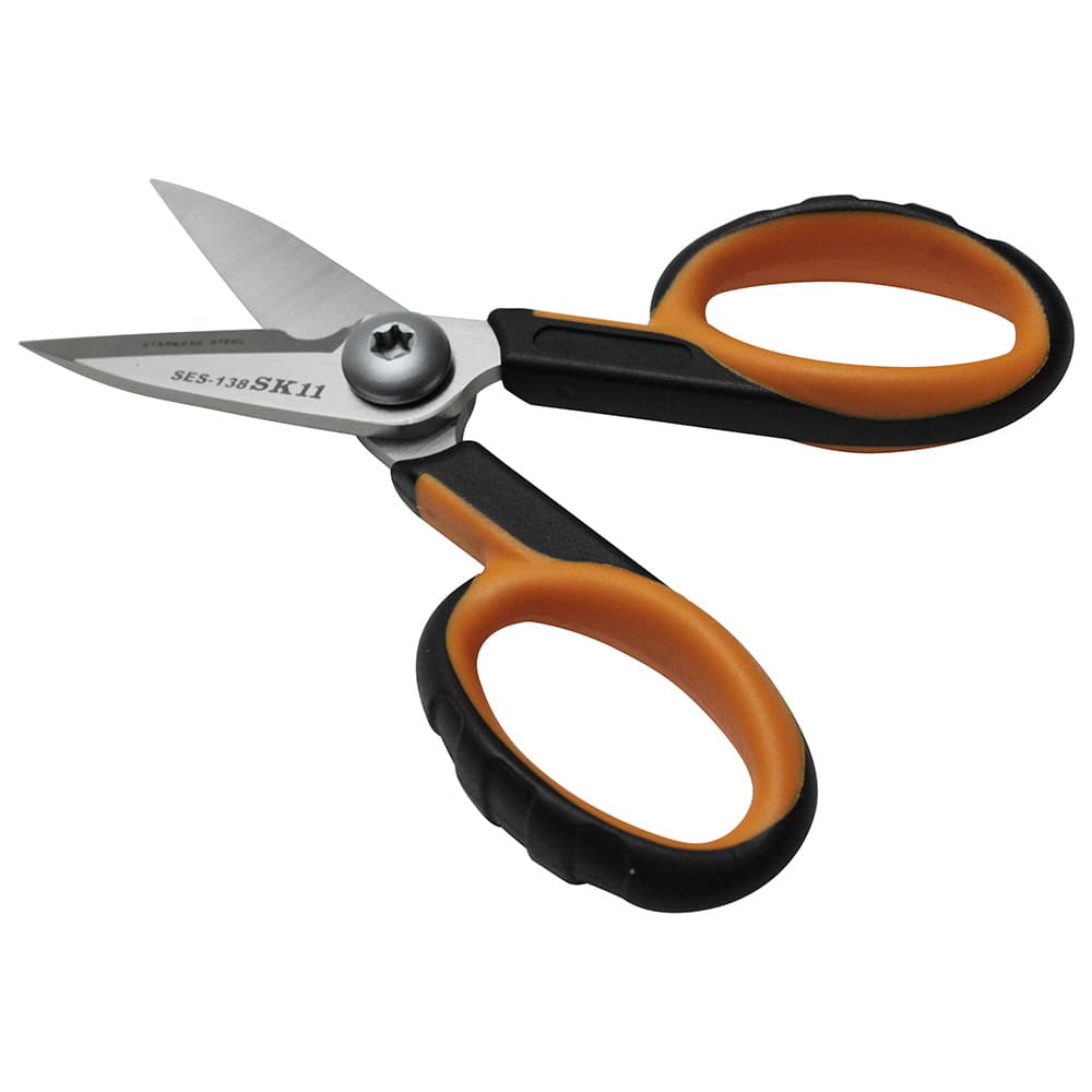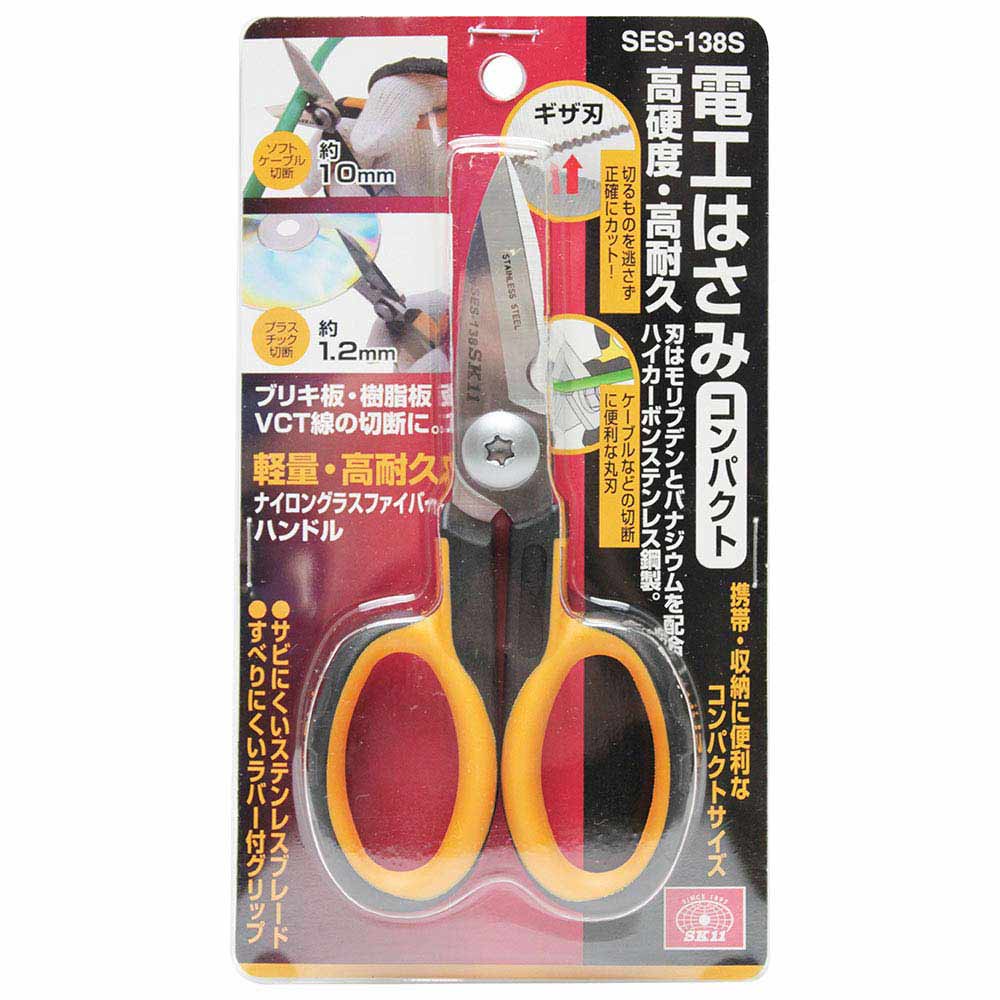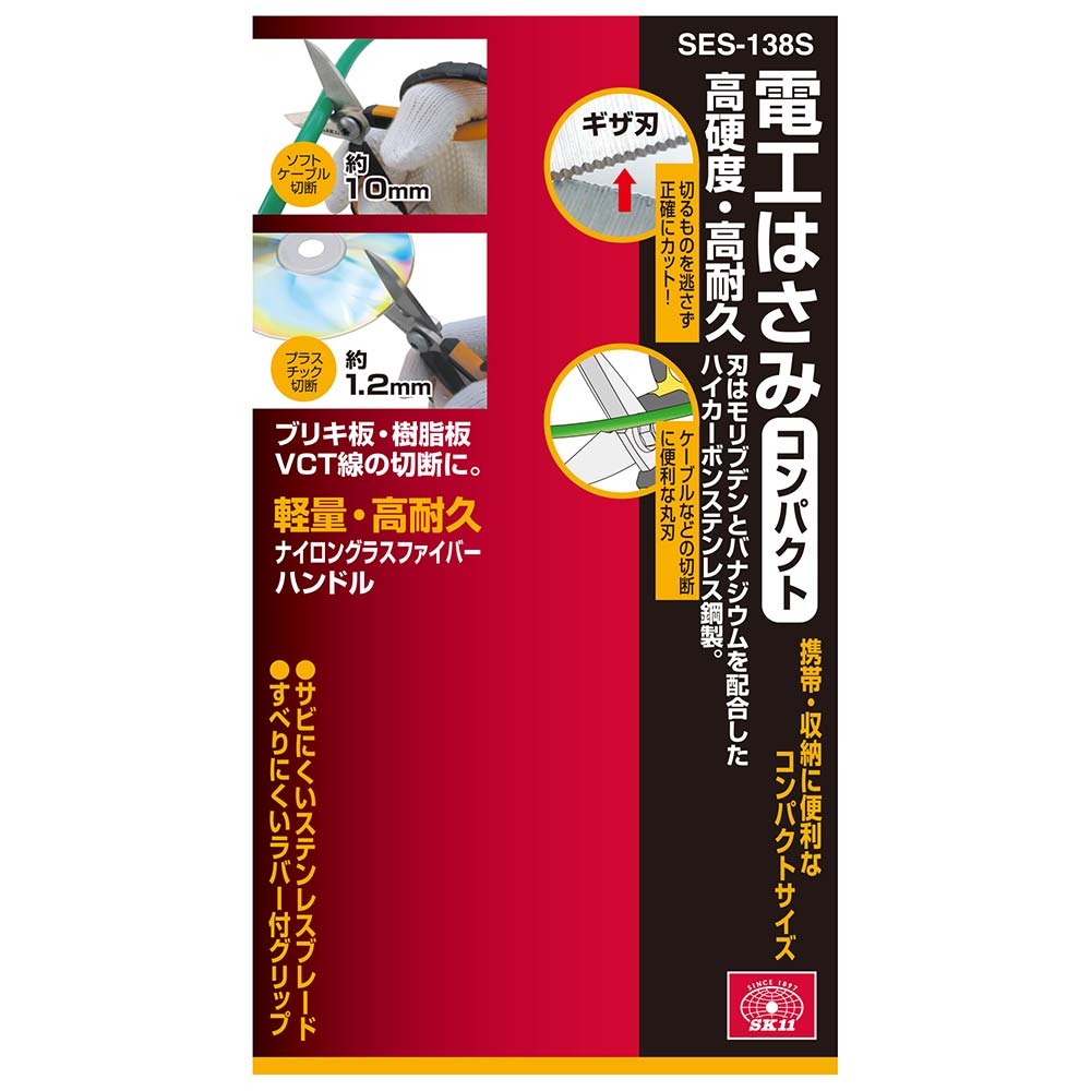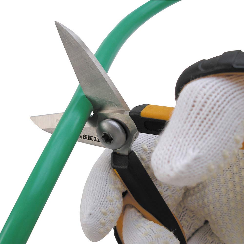 携帯、収納に便利なコンパクトサイズです。 ブリキ板・樹脂板・VCT線の切断。 刃はモリブデンとバナジウムを配合したハイカーボンステンレス鋼製で、高硬度・高耐久の電工はさみです。 ギザ刃が切るものを逃さず、スムーズにカットできます。 軽量・高耐久のナイロンファイバーグラスハンドルです。 ソフトケーブルやプラスチック、布、紙、アルミ線、針金など様々な素材をカットできます。 ●全長:約140mm。 ●刃部硬度:HRC58-60。 ●ラバー付グリップ。 ●切断目安:(アルミ・針金)0.5mm・(銅板・トタン・ブリキ)0.3mm・(プラ板)1.2mm。 ●切断目安:(皮革・ゴム板)4.0mm・(ソフトケーブル・アルミ線・銅線)1.0mm。
