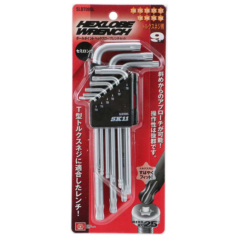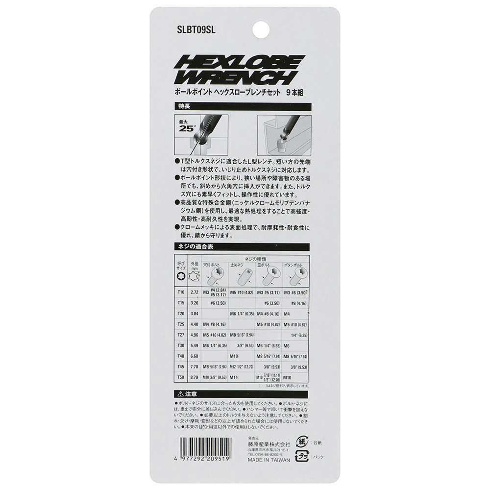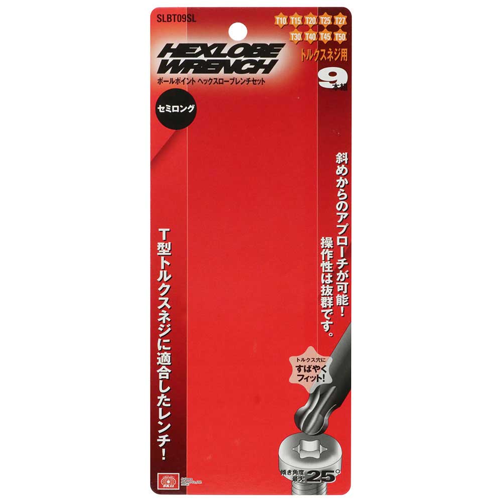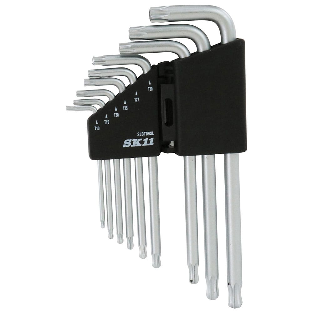 T型トルクスネジに適合したL型レンチセットです。 T型トルクスネジの締め付け、緩め作業。 ボールポイント形状により、狭い場所や障害物のある場所でも斜めからトルクス穴に挿入できます。 短い方の先端は穴付き形状で、いじり止めトルクスネジに対応します。 トルクス穴にすばやくフィットします。 ●9本組。 ●クロームメッキ加工。 ●セミロングタイプ。 ●セット内容:T10・T15・T20・T25・T27・T30・T40・T45・T50。