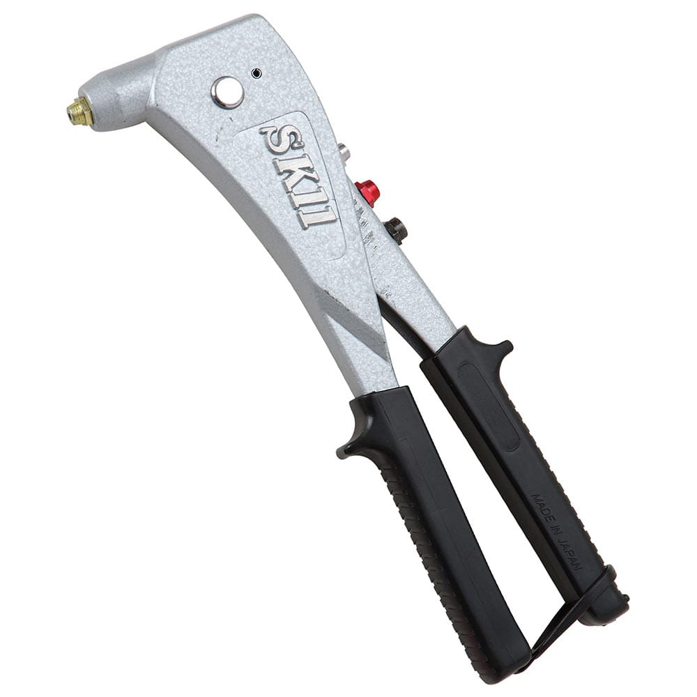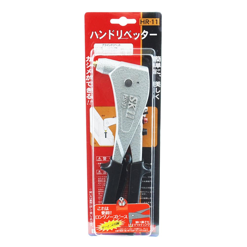 簡単に美しくカシメができます。 部材と母材の締結。 鉄板等を接合する場合、片側が密閉された母材でも、あらかじめドリルで接合する母材と部材に穴をあけて、ブラインドリベットをハンドリベッターにセットしてかしめて接合できます。 ●使用リベットサイズ:2.4mm・3.2mm・4.0mm・4.8mm。 ●付属品:ノーズピース(2.4mm・3.2mm・4.0mm・4.8mm)。 ●付属品:ロングノーズピース・ノーズピース取替スパナ。
