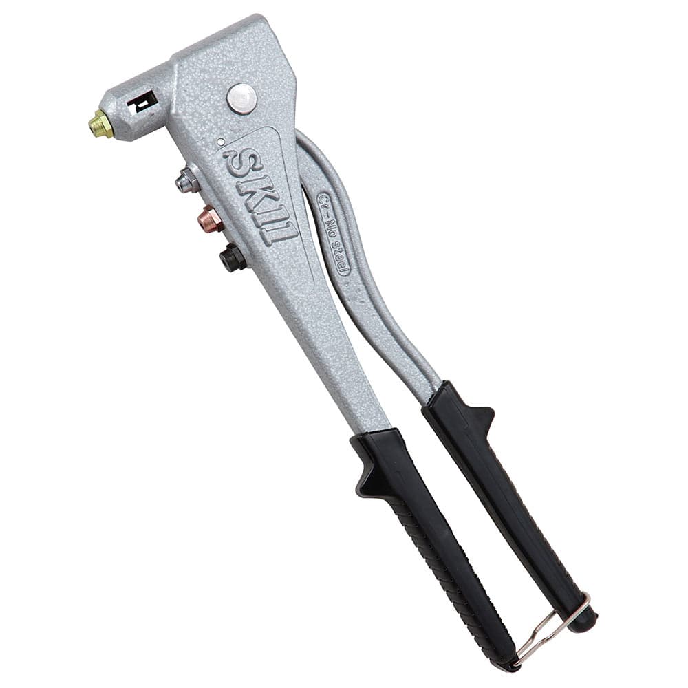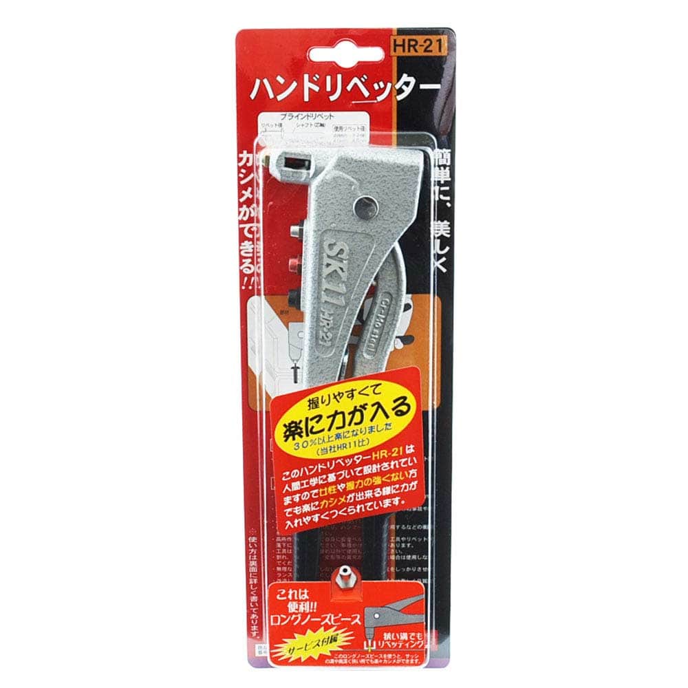 簡単に美しくカシメができます。 部材と母材の締結。 鉄板等を接合する場合、片側が密閉された母材でも、あらかじめドリルで接合する母材と部材に穴をあけて、ブラインドリベットをハンドリベッターにセットしてかしめて接合できます。 握りやすくて楽に力が入ります。 ●使用リベットサイズ:2.4mm・3.2mm・4.0mm・4.8mm。 ●付属品:ノーズピース(2.4mm・3.2mm・4.0mm・4.8mm)。 ●付属品:ロングノーズピース・ノーズピース取替スパナ。