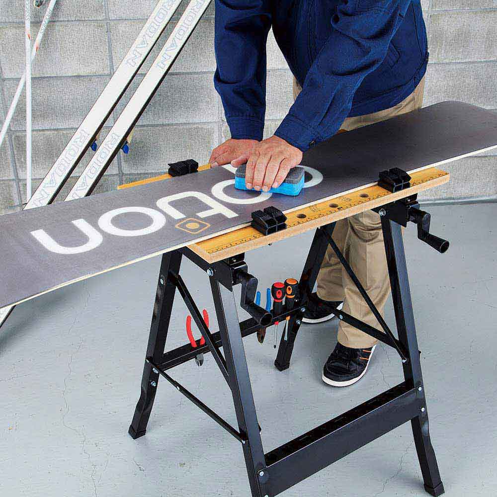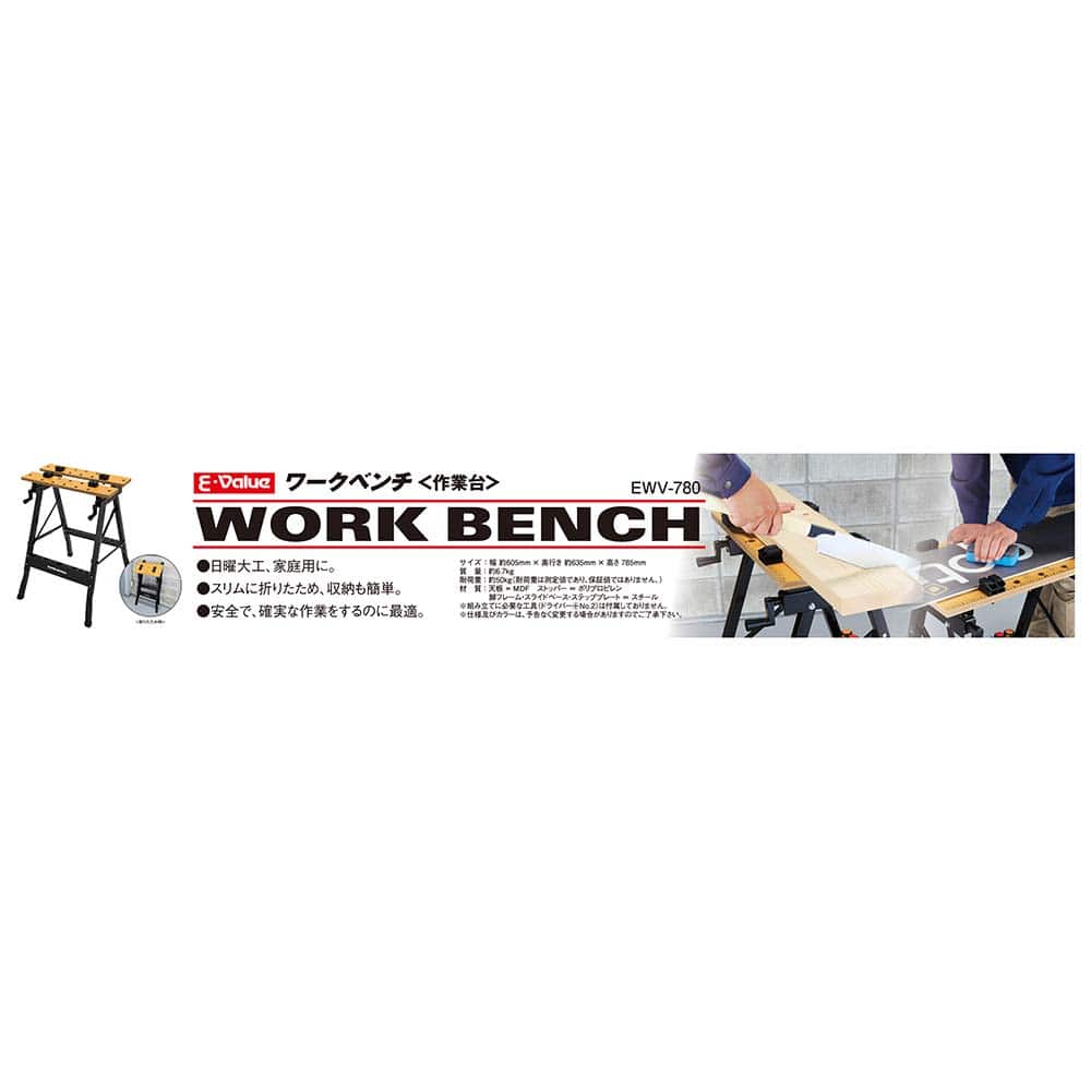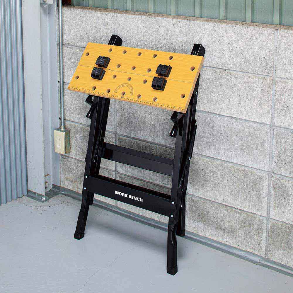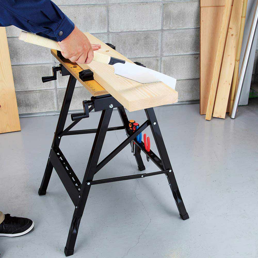安全で確実な作業を行うのに最適な作業台です。 日曜大工や家庭用。 スリムに折りたため、収納も簡単です。 安全で確実な作業を行うのに最適です。 バイス付きで木材等の固定にとても便利です。 ●サイズ(約):幅605×奥行635×高さ785mm。 ●重量:6.7kg。 ●耐荷重(約):50kg。