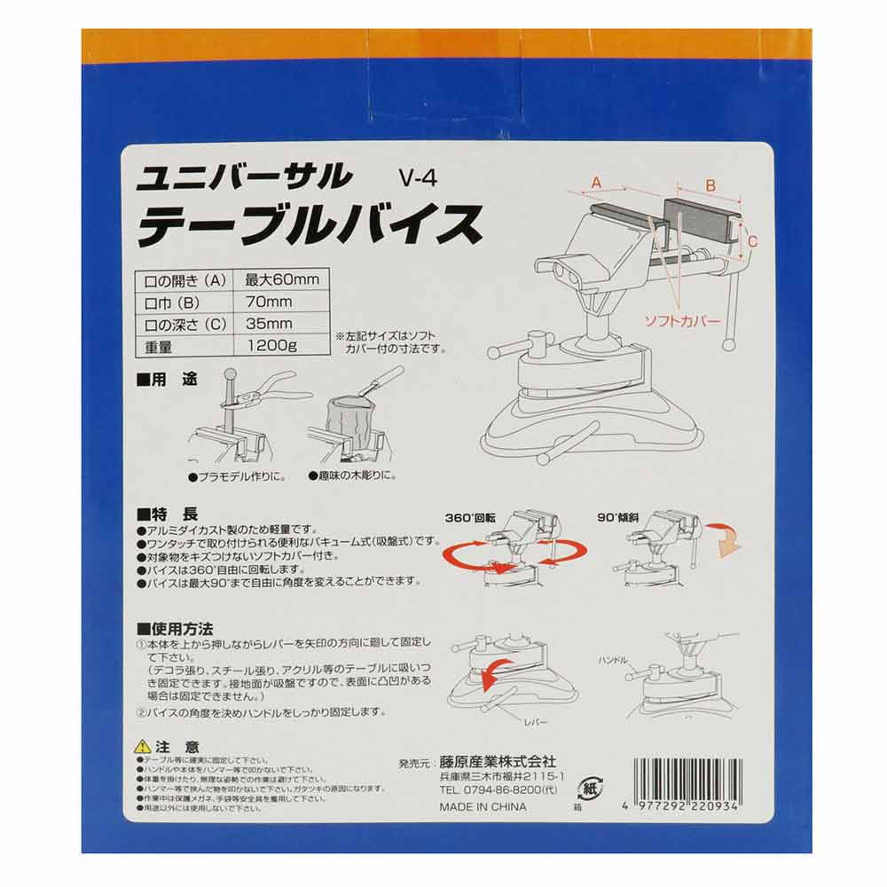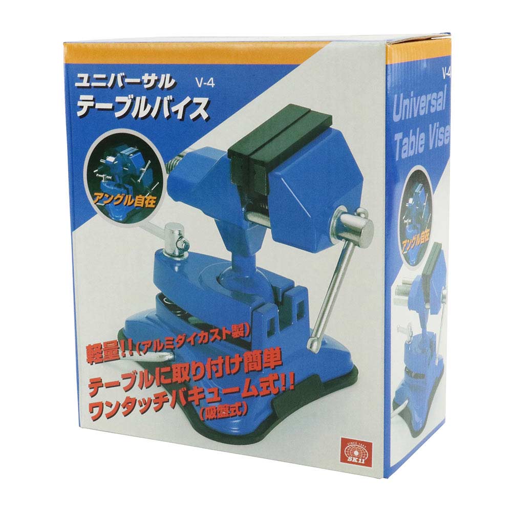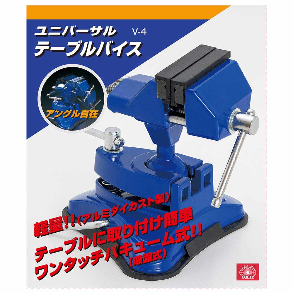 アングルが自在に変えられるので細かい加工に最適です。 プラモデル作り・木彫り等の木工作業。 テーブルに取り付け簡単なワンタッチバキューム式(吸盤式)です。 バイスは360度自由に回転します。 最大90度まで自由に角度を変えることが出来ます。 アルミダイカスト製のため軽量です。 対象物をキズつけないソフトカバー付きです。 ●口幅:70mm。 ●口の開き:最大60mm。 ●口の深さ:35mm。 ●重量:1200g。 ●約90度傾斜可能。 ●360度自在回転可能。
