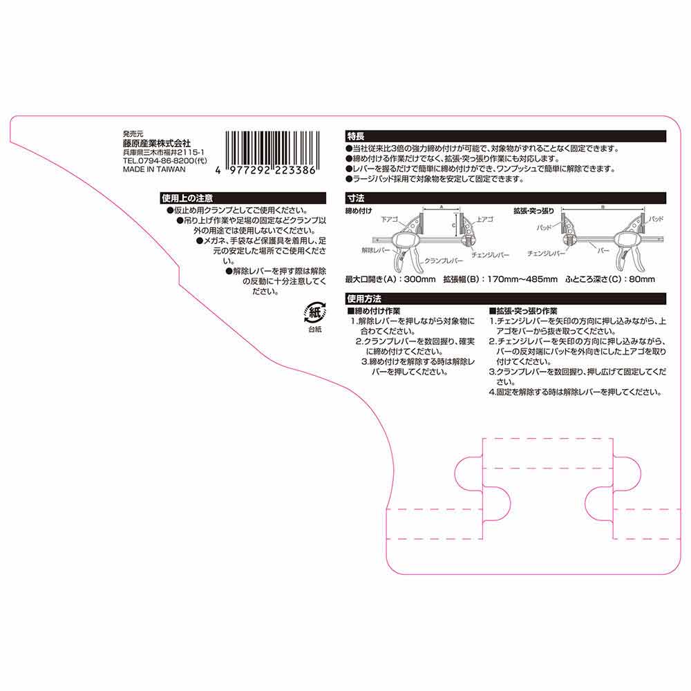 締付強度抜群です。 長物の固定。 長い物の固定が素早く簡単に行えます。 ラージパッド採用でしっかり締め付けが出来ます。 締め付ける作業と、広げる作業に使用出来ます。 ●口開き:300mm。 ●最大締付力:150kg。