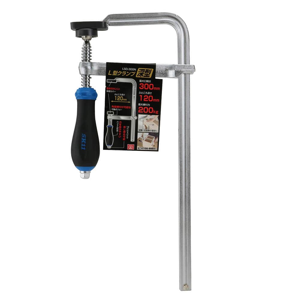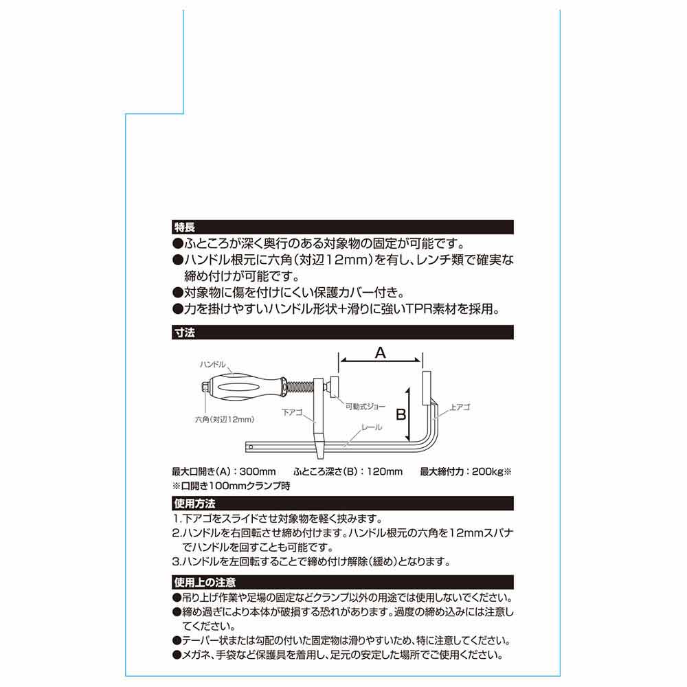 力の掛けやすいハンドル形状でスパナを掛ければ楽に強力な増し締めが可能です。 切断・切削時の固定、加工材の仮組・接着固定に。 ふところが深く奥行のある対象物の固定が可能です。 対象物に傷を付けにくい保護カバー付きです。 角度締付が可能な可動式ジョー仕様です。 ●最大口開き:300mm。 ●最大締付力:200kg。 ●ふところ深さ:120mm。