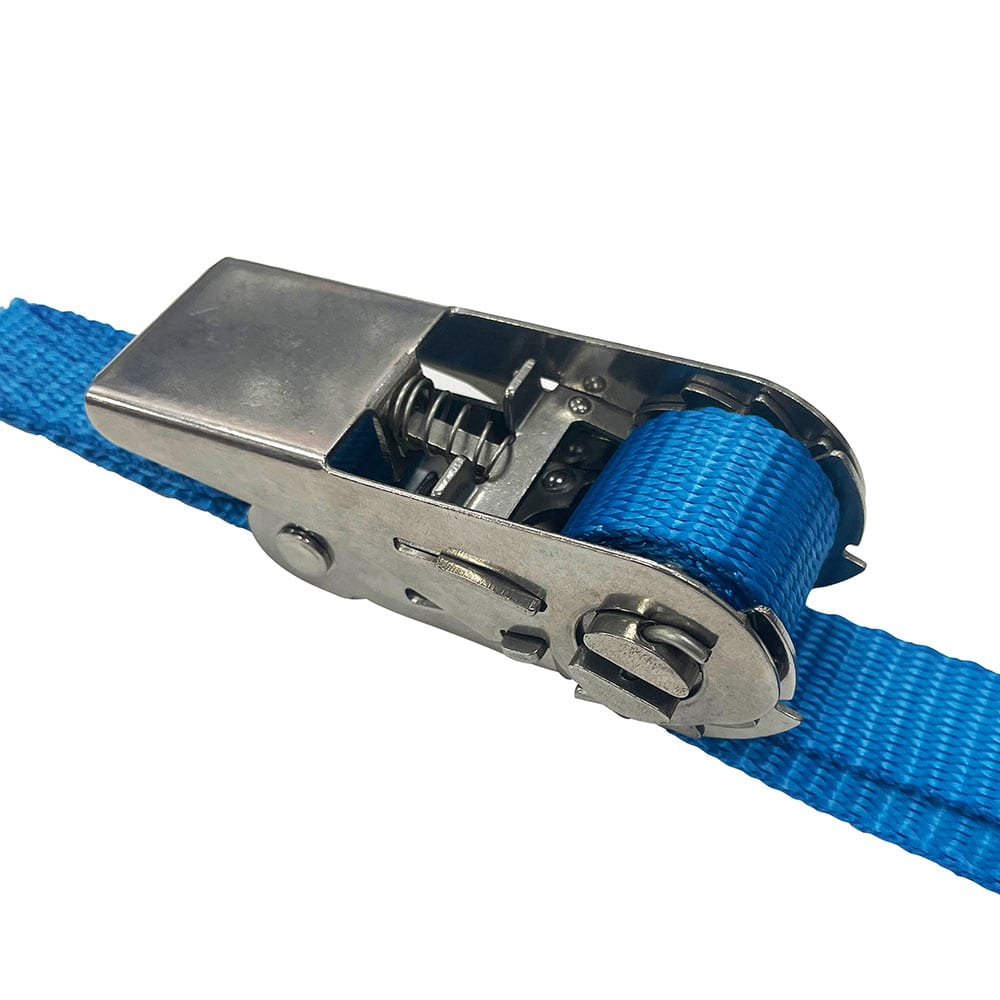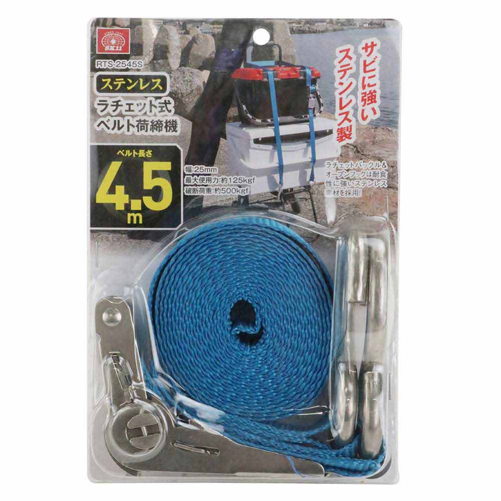 ラチェットバックル&オープンフックは耐食性に強いステンレス素材を採用しました。 荷物運搬時、荷崩れ防止・転倒防止の結束・固定。 屋外での使用、水・潮風の影響を受けるシーンの使用に適しています。 ●ベルト幅:25mm。 ●全長:4.5m(固定側0.5m/調整側4.0m)。 ●最大使用力:1.25kN(127kg)、破断荷重:5.0kN(510kg)。 ●バックルの種類:ラチェットバックル。 ●端末の仕様:オープンフック。