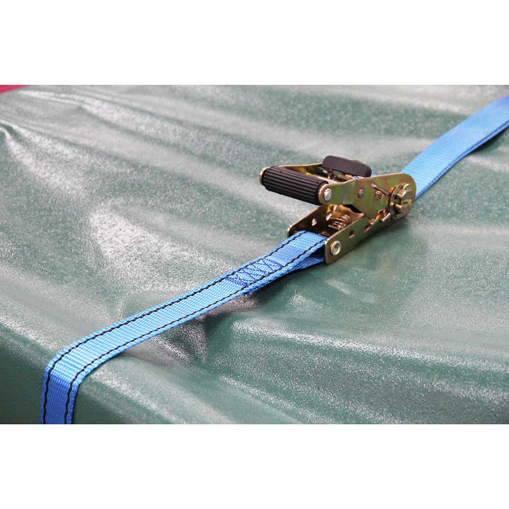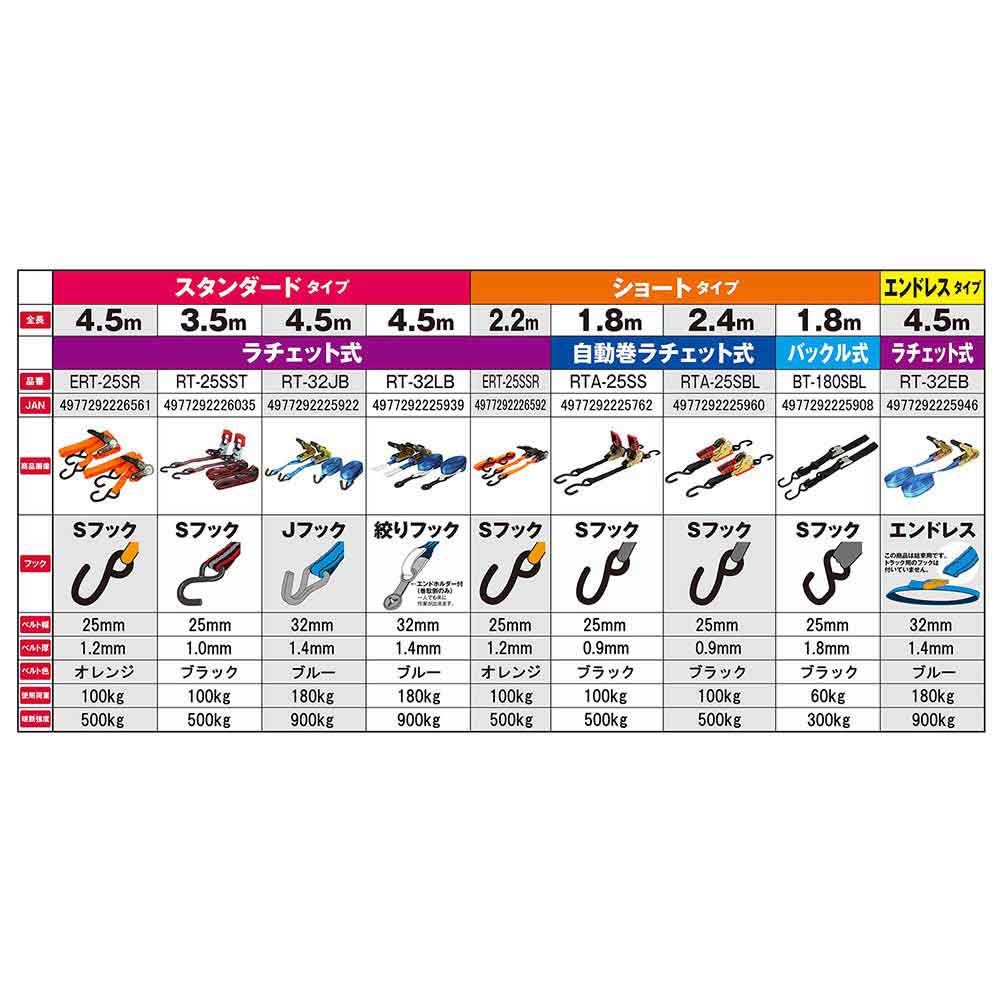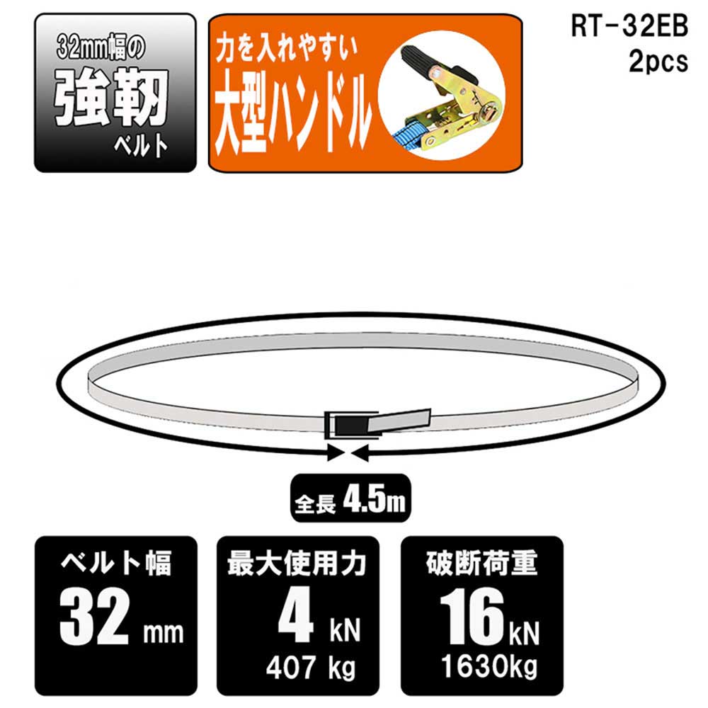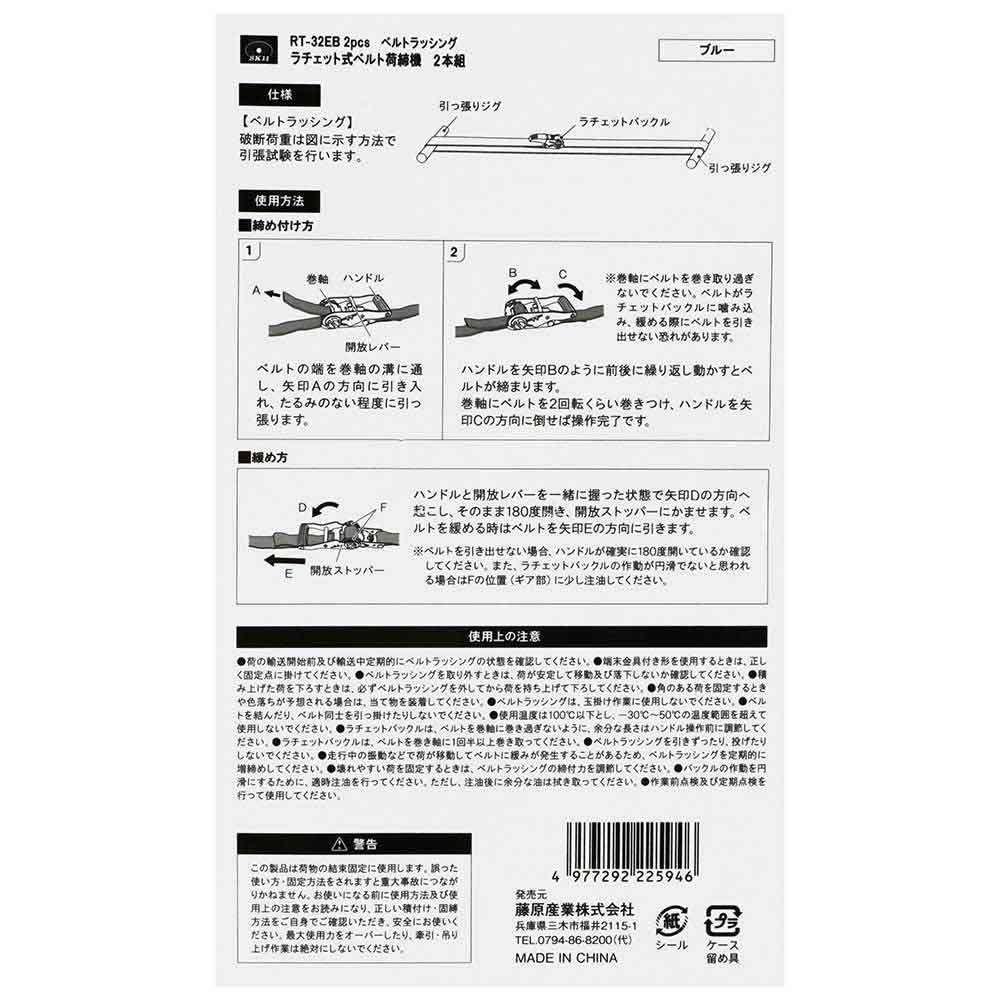 ラチェットバックル式でしっかりと確実な荷締作業ができます。 荷物運搬時、荷崩れ防止・転倒防止の結束・固定。 荷物に巻き付けラチェットバックルで確実に結束できます(エンドレスタイプのため端末に金具は付いていません)。 ハンドル操作時に手の当たりが優しいラバー素材付きハンドルを採用しています。 ●ベルト幅:32mm。 ●全長:4.5m。 ●最大使用力:4kN(407kg)、破断荷重:16kN(1630kg)。 ●バックルの種類:ラチェットバックル。 ●端末の仕様:エンドレス。 ●ベルトカラー:ブルー。 ●2本組。