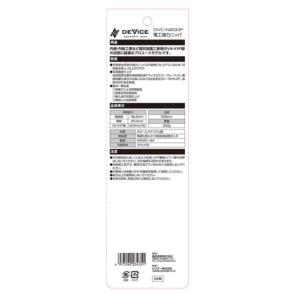 シャープな切れ味と耐久性を持ち合わせたハイブリッド刃設計です。 配線用の電線、結束バンド等の切断。 刃部は独自開発の最先端研磨技術、マイクロミラーブレードで電線被膜へ滑らかに食い込み軽い切断を実現しました。 刃角度は従来の強力ニッパより鋭角に仕上げているため切断面は美しい仕上がりで、少ない力で線材を切断できます。 ●全長:208mm。 ●切断能力:(VA・VVA線)径2.6mm×3芯・(銅線)径3.5mm・(軟鉄線)径2.5mm。 ●熱処理:無酸化焼入れ+高周波焼き入れHRC60~64。 ●刃部形状:ラウンド刃。