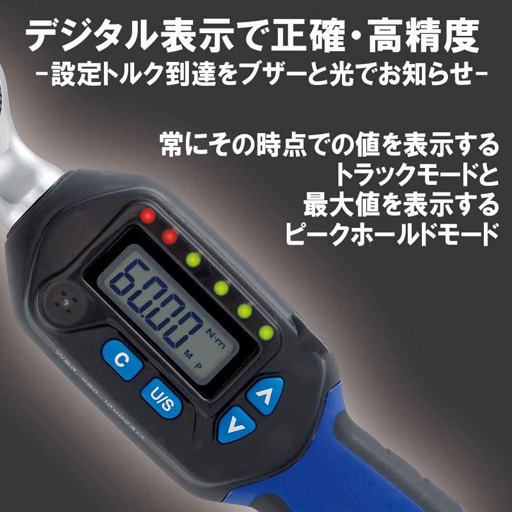 デジタル表示で正確、高精度なトルク管理が可能で、しかも操作が簡単です。 バイクなどのタイヤ交換や、ボルト・ナットの締付けトルク値の測定作業。 設定トルク到達時、ブザー音とLEDの光でお知らせします。 右ネジ、左ネジ両方向の測定が可能です。 設定トルク値と測定トルク値を他の単位換算出来ます。 約2分間操作しなければ自動的に電源が切れるオートスリープ機能付きです。 ●差込角:9.5mm(3/8インチ)・最大測定トルク値:60N・m。 ●測定範囲:3.0~60N・m・精度保証範囲:12~60N・m。 ●測定精度:右ネジ±3%・左ネジ±4%。 ●測定単位:N・m(単位換算機能付きkgf・cm、lbf・in、lbf・ft)。 ●ラチェットギア数:52山。 ●電源:単4乾電池2本。 ●操作モード:ピークホールドモード、トラックモード。 ●付属品:単4乾電池2本・電池カバー用ドライバー・ハードケース・取扱説明書・検査成績表。