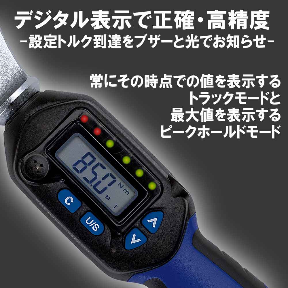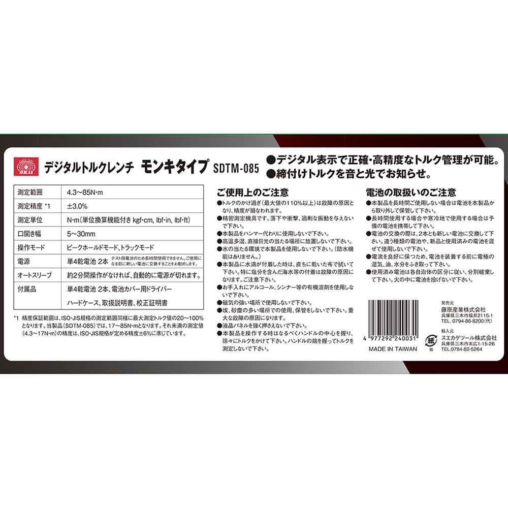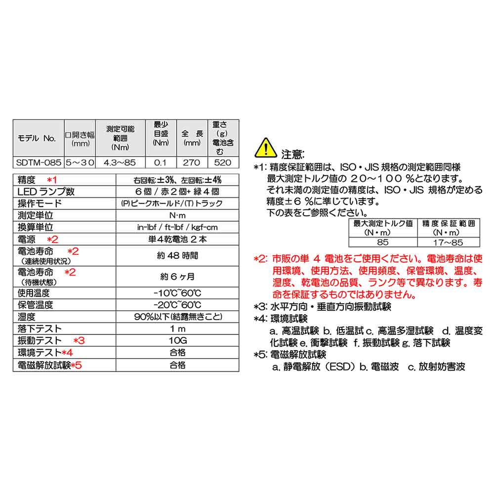 精度保証範囲は、ISO・JIS規格の測定範囲同様に最大測定トルク値の20~100%となります。当製品(SDTM-085)では、17~85N・mとなります。それ未満の測定値(4.3~17N・m)の精度は、ISO・JIS規格が定める精度±6%に準じています。 市販の単4電池をご使用ください。電池寿命は使用環境、使用方法、使用頻度、保管環境、温度、湿度、乾電池の品質、ランク等で異なります。寿命を保証するものではありません。 トルクのかけ過ぎ(最大値の110%以上)は故障の原因となり、精度が損なわれます。精密測定機具です。落下や衝撃、過剰な振動を与えないでください。本製品をハンマー代わりに使用しないで下さい。水の当たる環境で本製品を使用しないで下さい。(防水機能はありません。)本製品に水滴が付着した時は、直ちに乾いた布で拭いて下さい。特に塩分を含んだ海水等の付着は故障の原因になります。ご注意下さい。お手入れにアルコール、シンナー等の有機溶剤を使用しないで下さい。磁気の強い場所で使用しないで下さい。埃、砂塵の多い場所での使用、保管をしないで下さい。重大な故障の原因になります。液晶パネルを強く押さえないで下さい。本製品を操作する時はなるべくハンドルの中心を握り、徐々にトルクをかけて下さい。ハンドルの端を握ってトルクを測定しないで下さい。